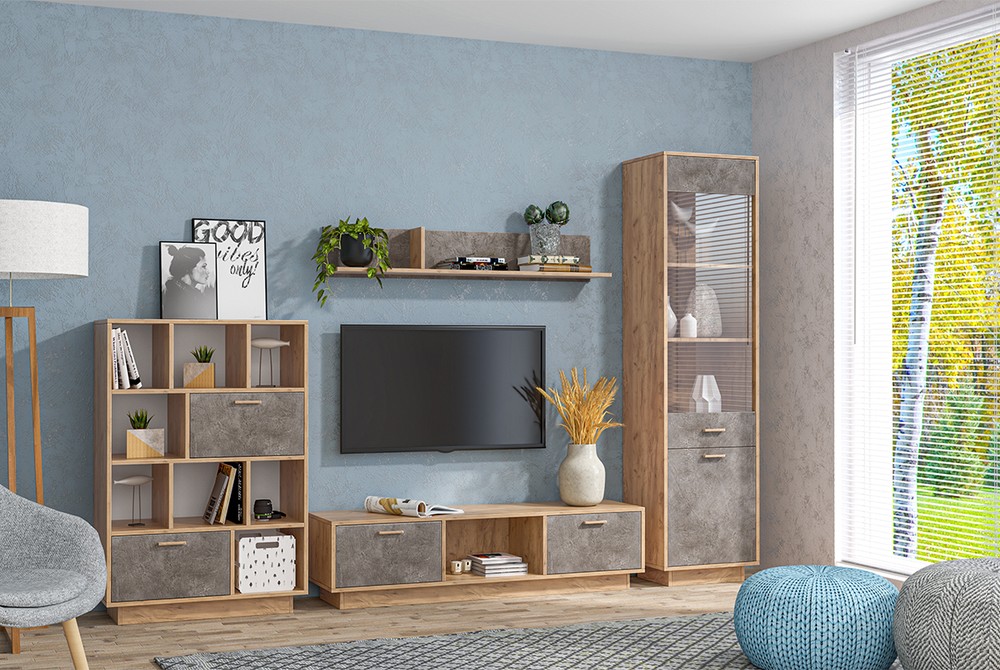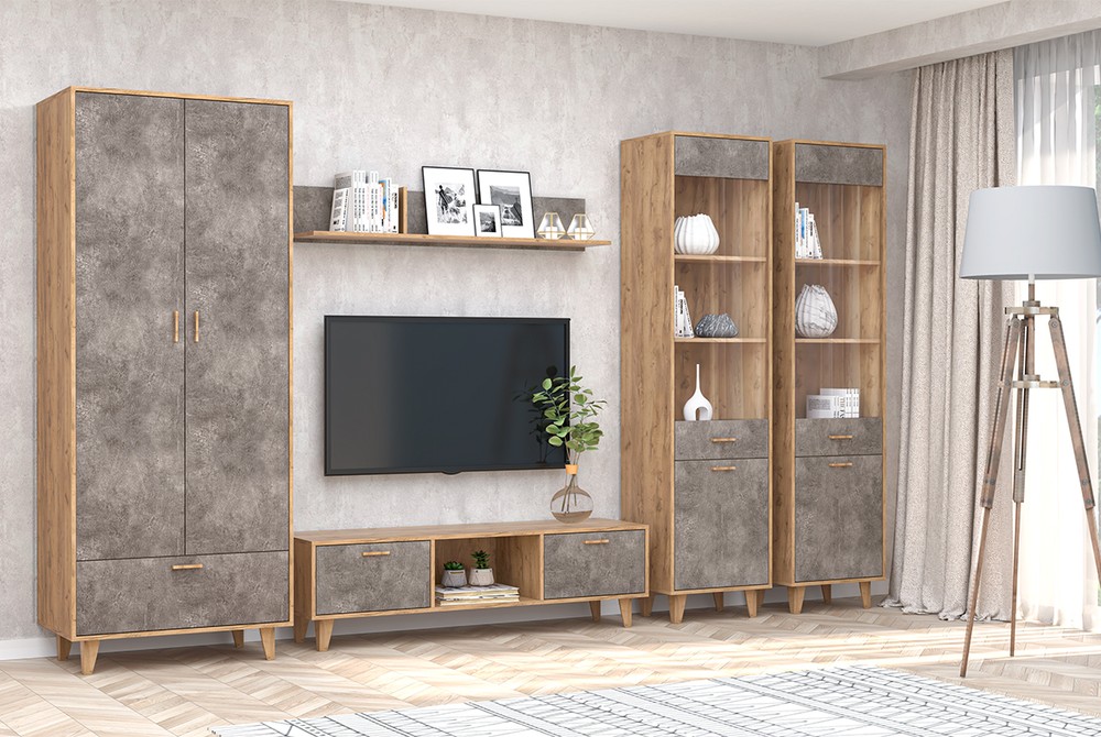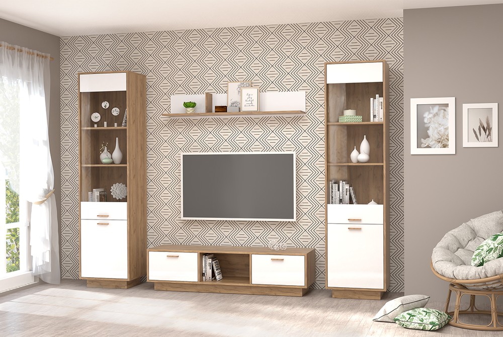 В комплект входит два вместительных шкафа, тумба ТВ, витрины и полки.