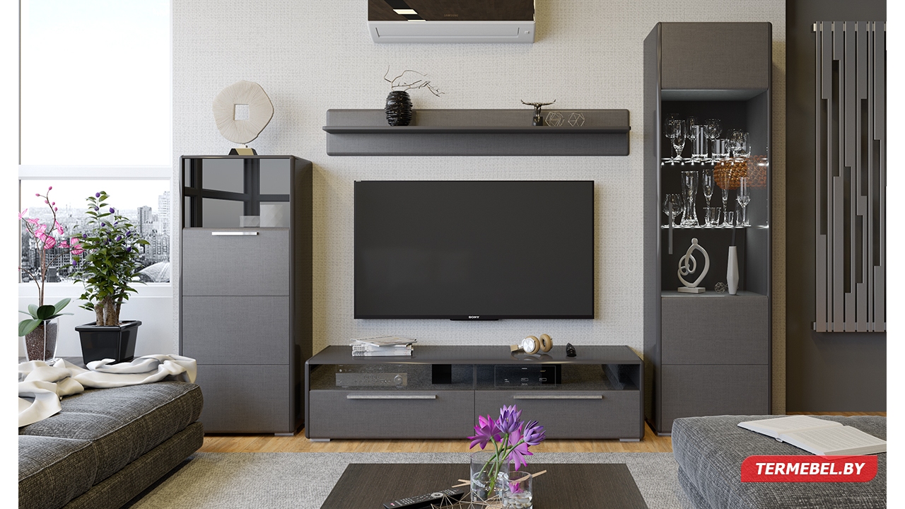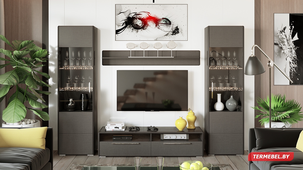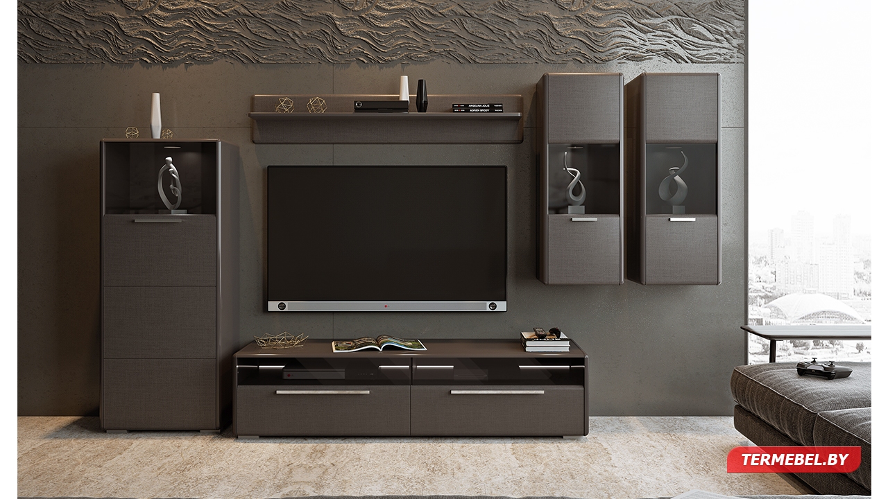 Современный и стильный набор мебели для зала в лаконичном стиле и приятной темной кофейной расцветке. Пенал со стеклянной витриной прекрасно подойдет для размещения хрустальной посуды или сувениров. Высокий комод имеет открытую нишу, также как и тумба под ТВ. Завершает композицию настенная полка.