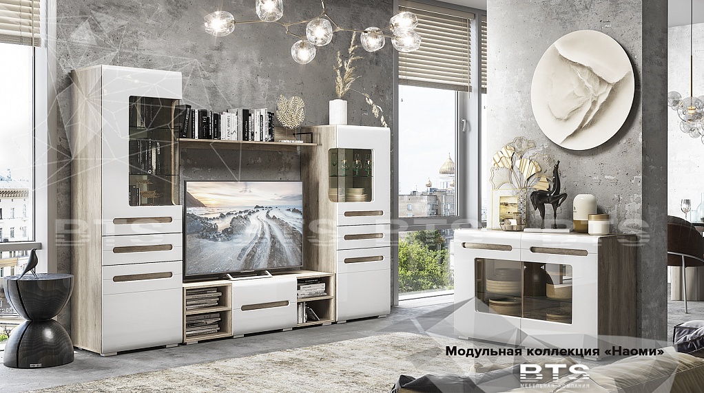 Модульная гостиная «Наоми» - это свежий одухотворенный интерьер, наполненный светом, комфортом и функциональностью. Уникальная геометрия фрезерованных фасадов создает атмосферу ультра-современности и минимализма. Контрастность сочетания матового декора корпуса элитного дерева «Дуб Каньон» с безмятежно-белыми глянцевыми створками относит нас к спокойствию, экологичности и безмятежности. Оригинальное конструктивное решение коллекции – ручки фасадов, выполненные путем сложной фрезеровки и подчеркнутые углубленным декором дубового спила.