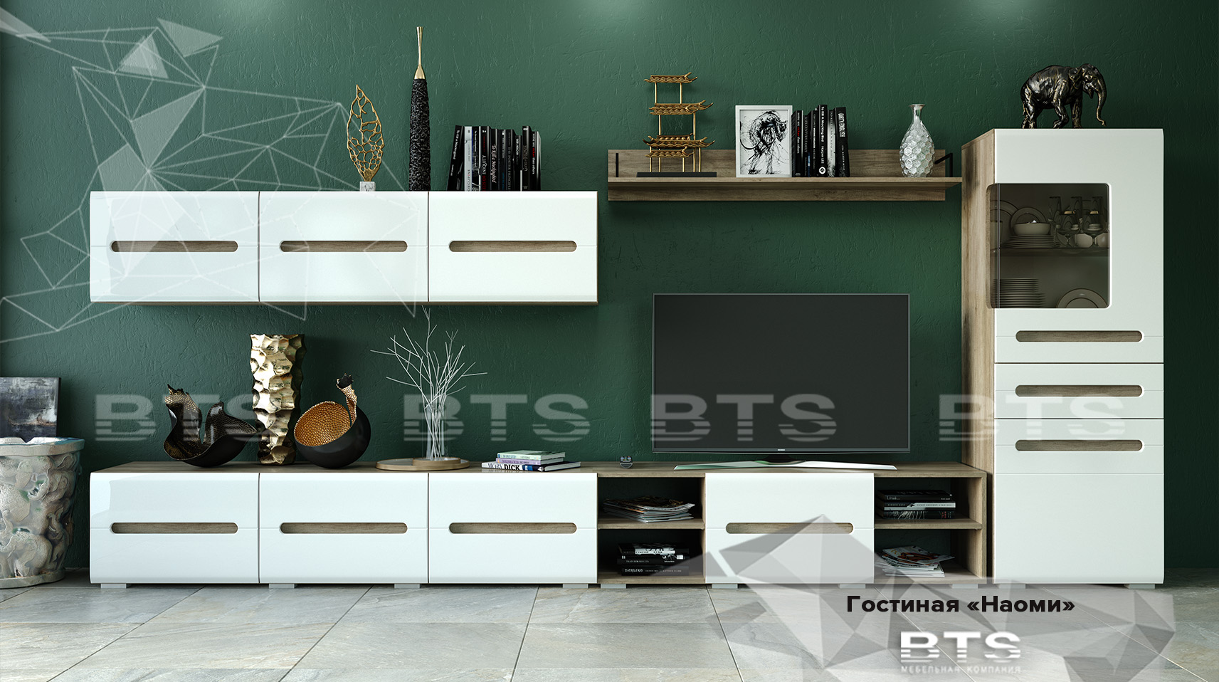 В комплект входит: Наоми Шкаф ШК-23, Наоми Тумба ТВ в комплекте с полкой ТБ-16, Наоми Шкаф ШК-24, Наоми Комод КМ-10.