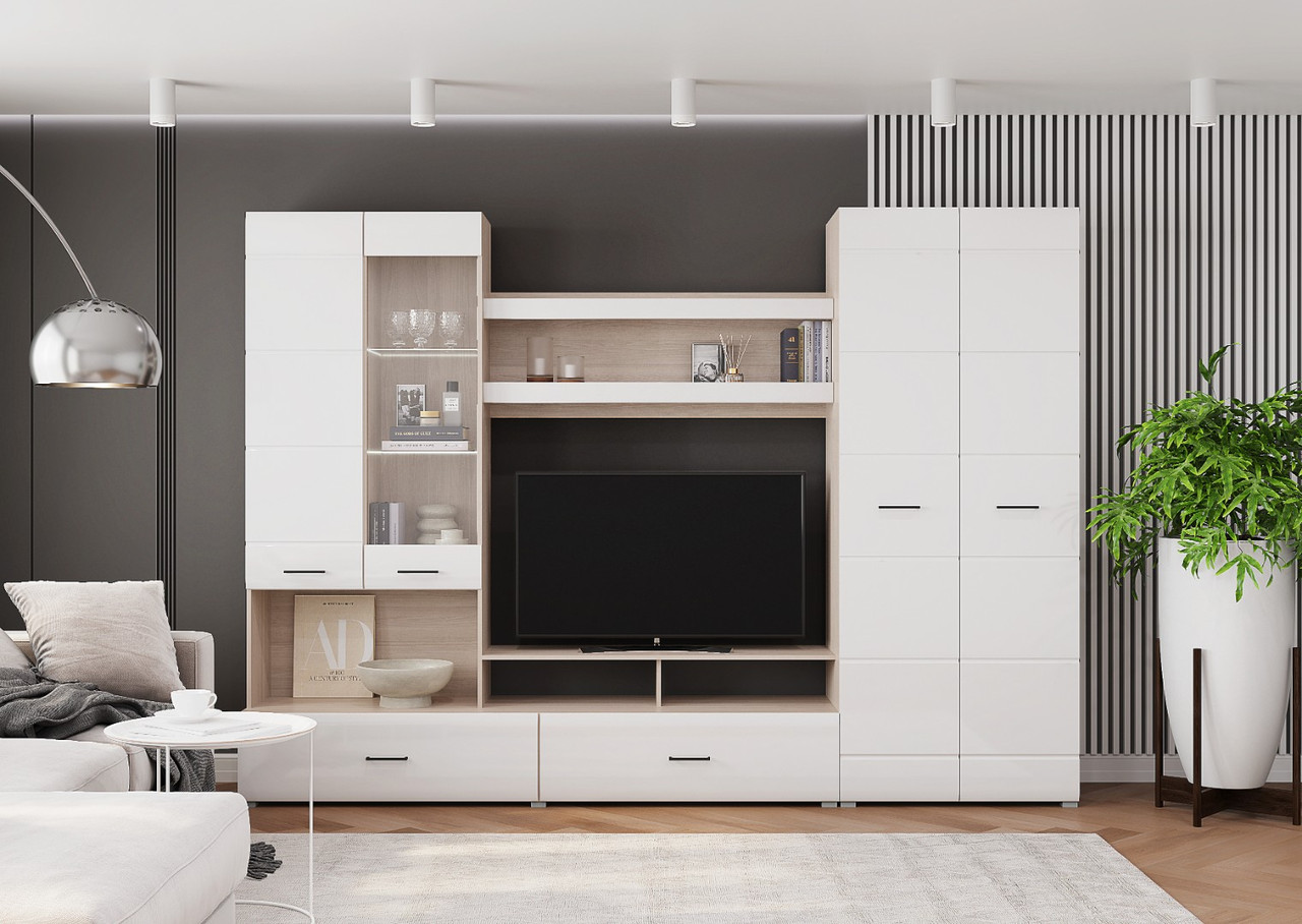Гостиная «Ненси-1» Белый глянец / Ясень светлый Горизонт
