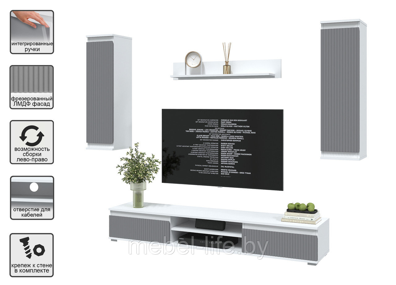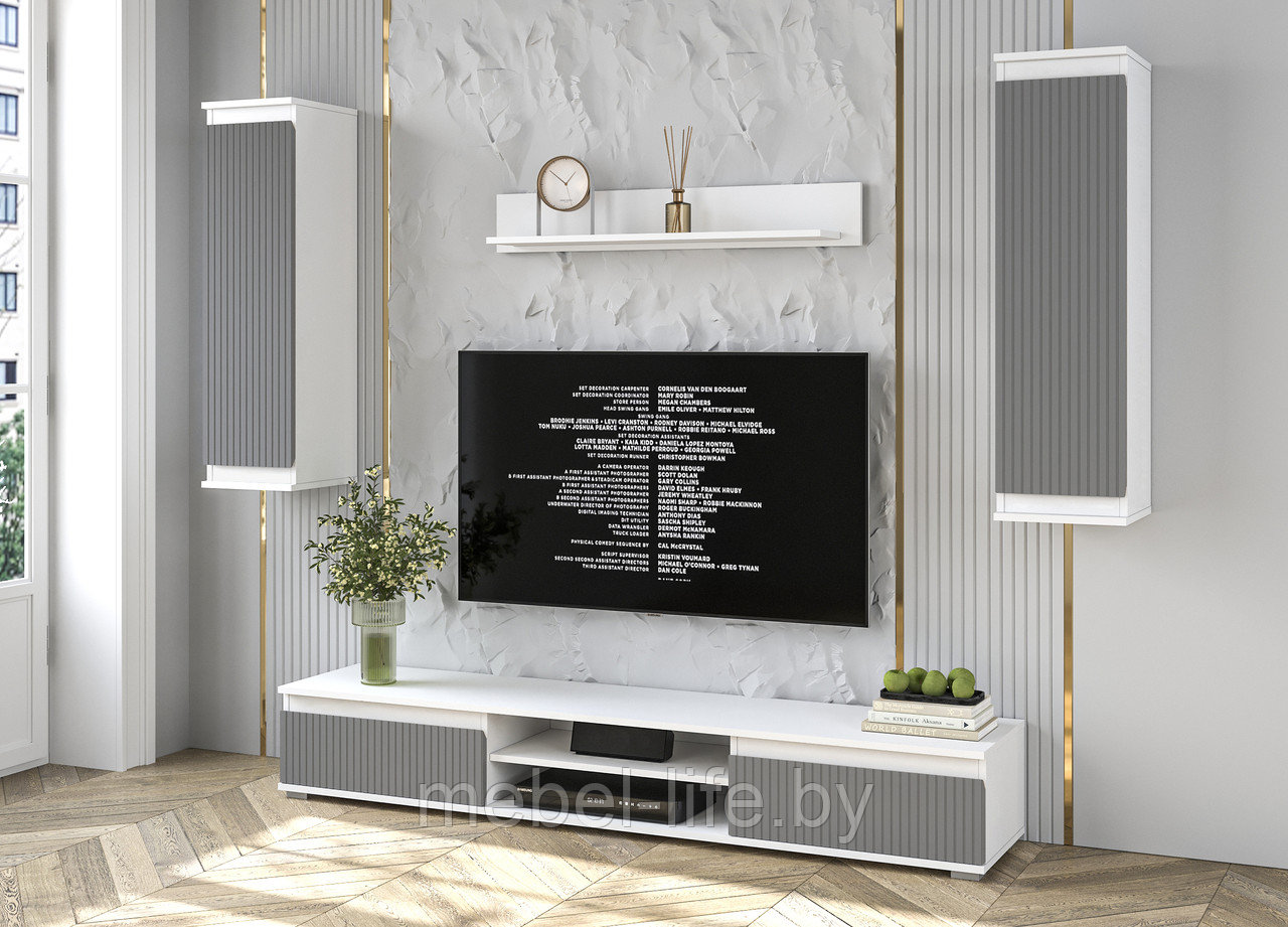 Размеры: 2400х450х2030 мм. Широкая тумба для ТВ. Разноуровневые модули.
