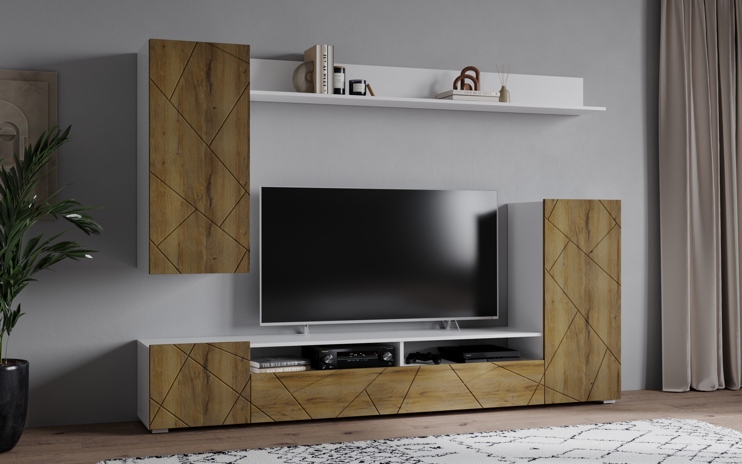 Компактная модульная стенка для гостиной. Стильная стенка, которая станет украшением вашего интерьера. Выполнена в современном дизайне с тиснением в виде асимметричных полос.