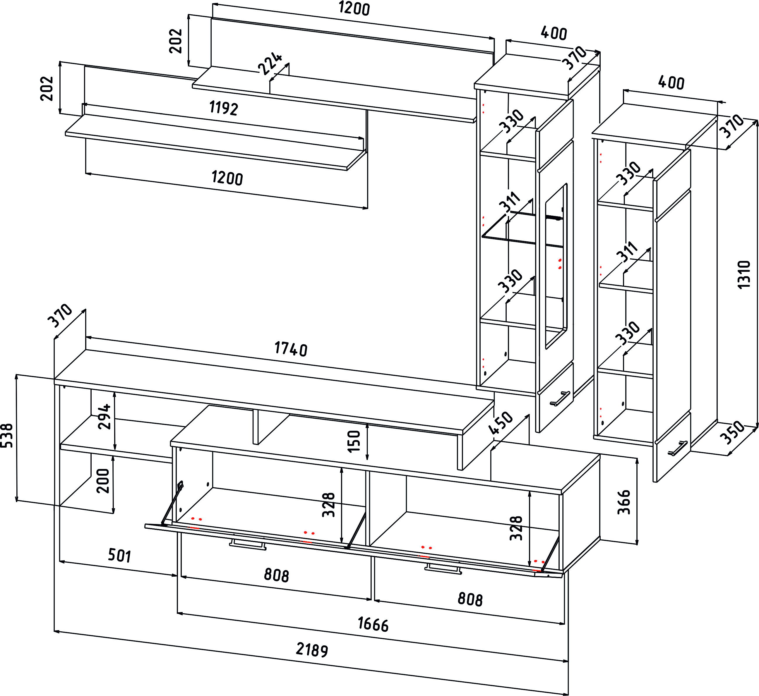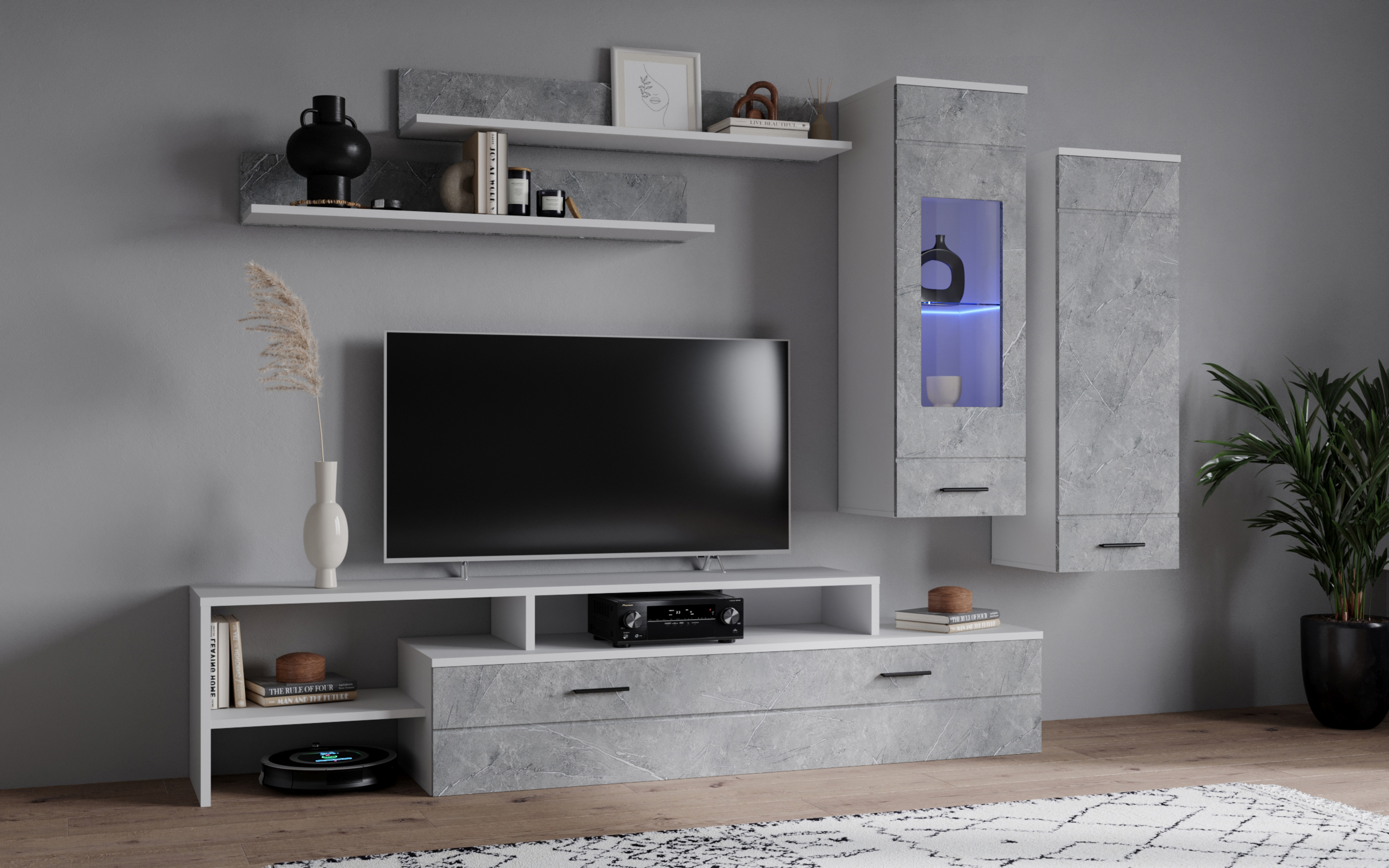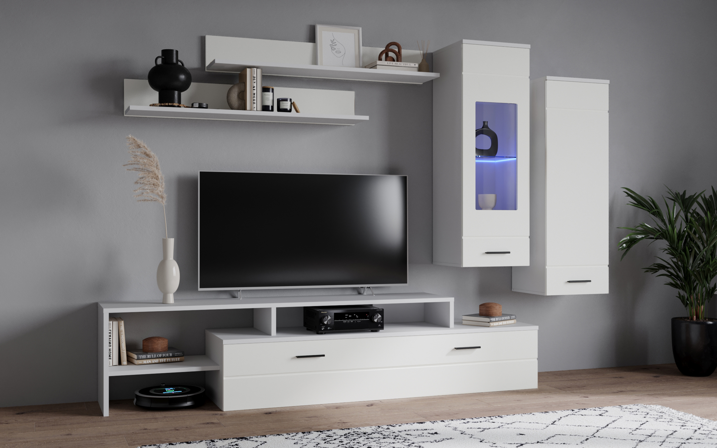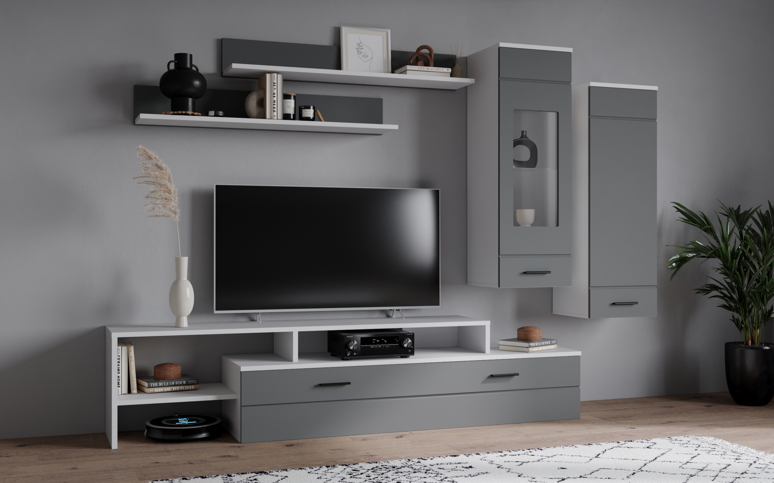 Модульный набор для гостиной, который позволит создать уютное и функциональное пространство. Набор доступен в нескольких расцветках: от белого до тёмно-серого, что позволит подобрать вариант, идеально сочетающийся с вашим интерьером.