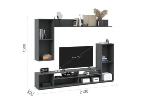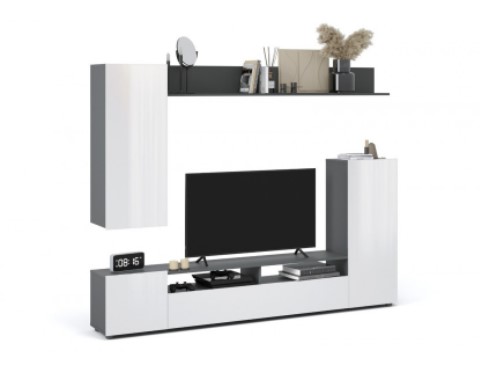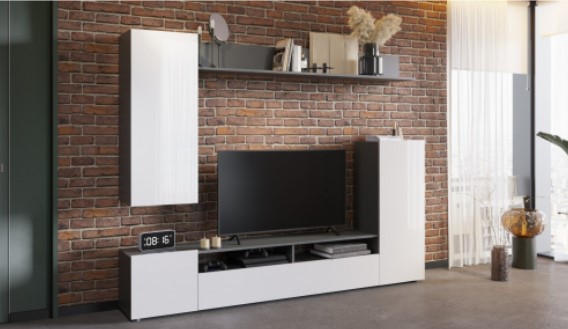 Мини-стенка «Нео» — современное, функциональное решение для гостиной, поможет рационально обустроить комфортную зону для отдыха и просмотра TV. Открытые полки вместят в себя всё самое необходимое. Корпус выполнен в модном антрацитовом цвете, который подчеркивает простые и легкие геометрические формы стенки. Белые глянцевые фасады создают гармонию, свет и уют.