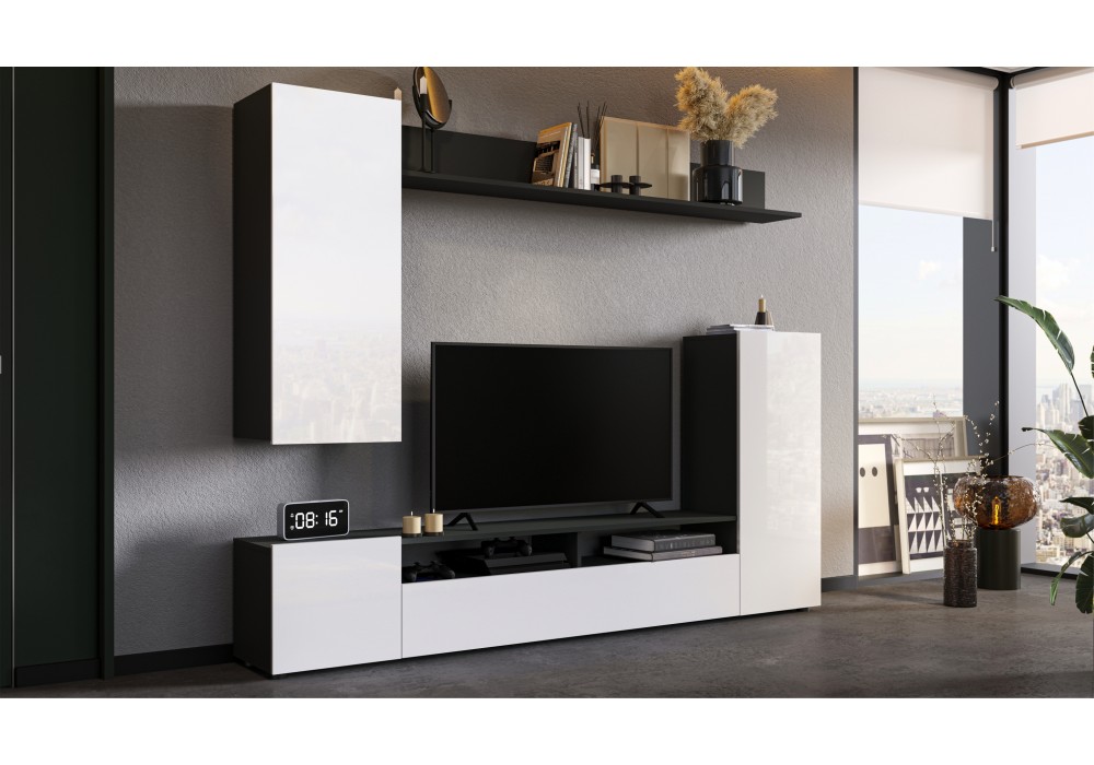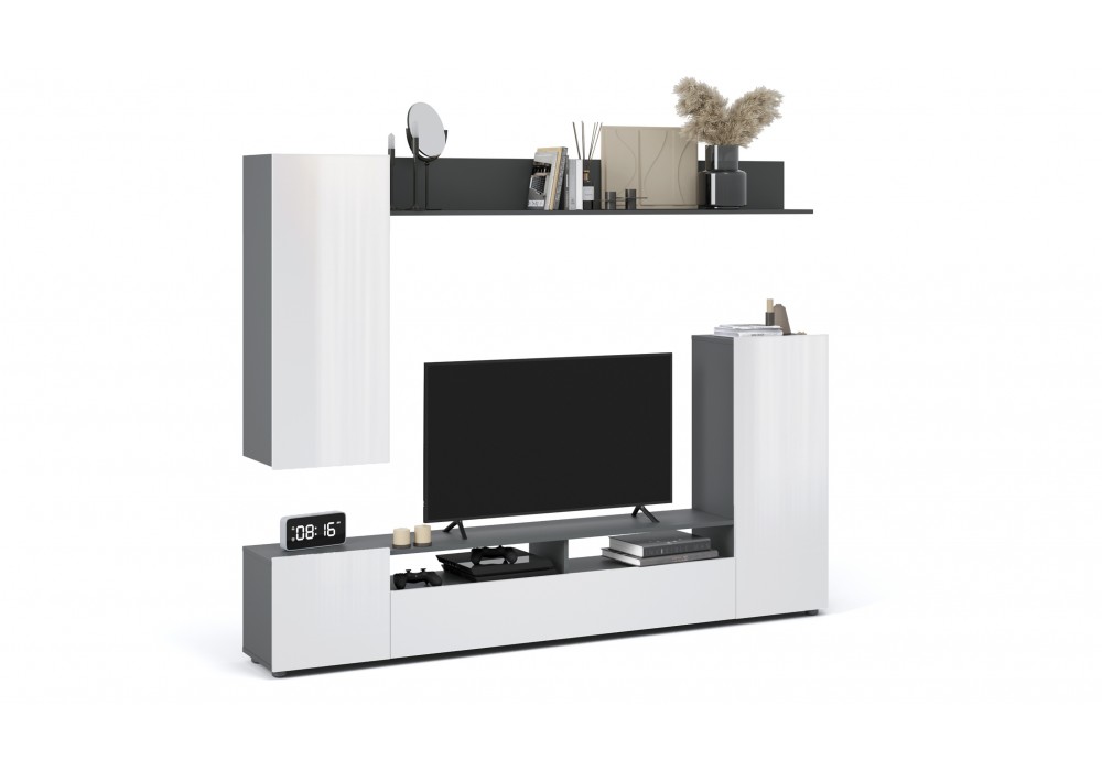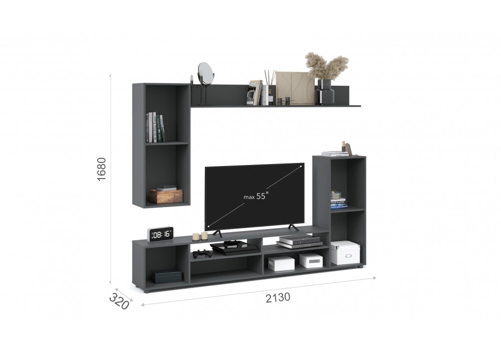 Мини-стенка «Нео» — современное, функциональное решение для гостиной, поможет рационально обустроить комфортную зону для отдыха и просмотра TV. Большая ниша для телевизора, закрытые шкафчики и открытые полки вместят в себя всё самое необходимое. Корпус выполнен в модном антрацитовом цвете, который подчеркивает простые и легкие геометрические формы стенки.