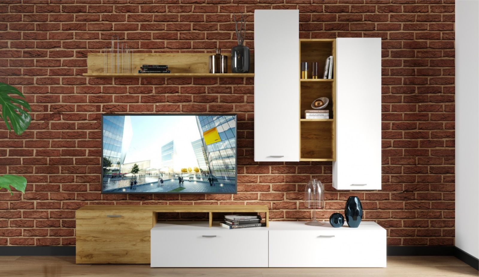 Гостиная с полками и тумбой