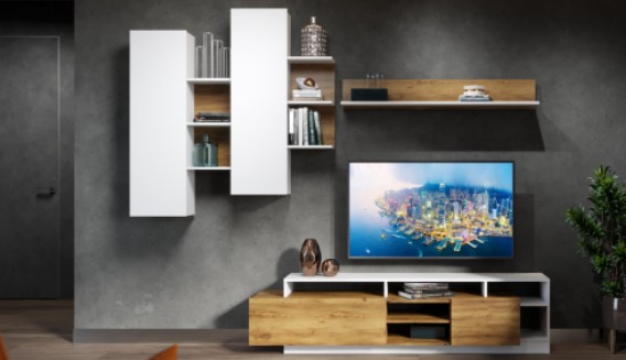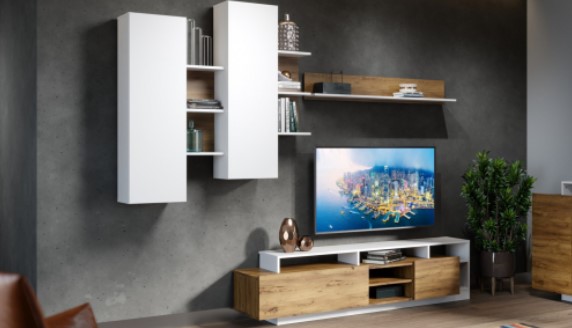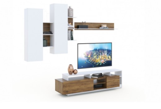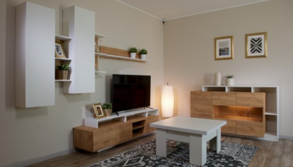 Стенка Невио-2 выполнена с использованием новейшего декора «Дуб крафт золотой» в сочетании с белым - подходит для стилистических направлений лофт, минимализм, скандинавский. Простые формы, естественные природные оттенки создают гармоничную и умиротворенную атмосферу гостиной. Четкая текстура дерева, белый цвет, отсутствие внешней фурнитуры, углубленный цоколь - создают визуальную легкость и компактность стенки. Фасады, выступающие на 1см поверх корпуса, заменяют ручки. Стенку дополняет вместительный комод с витриной. Мебель выполнена из высококачественных экологичных материалов