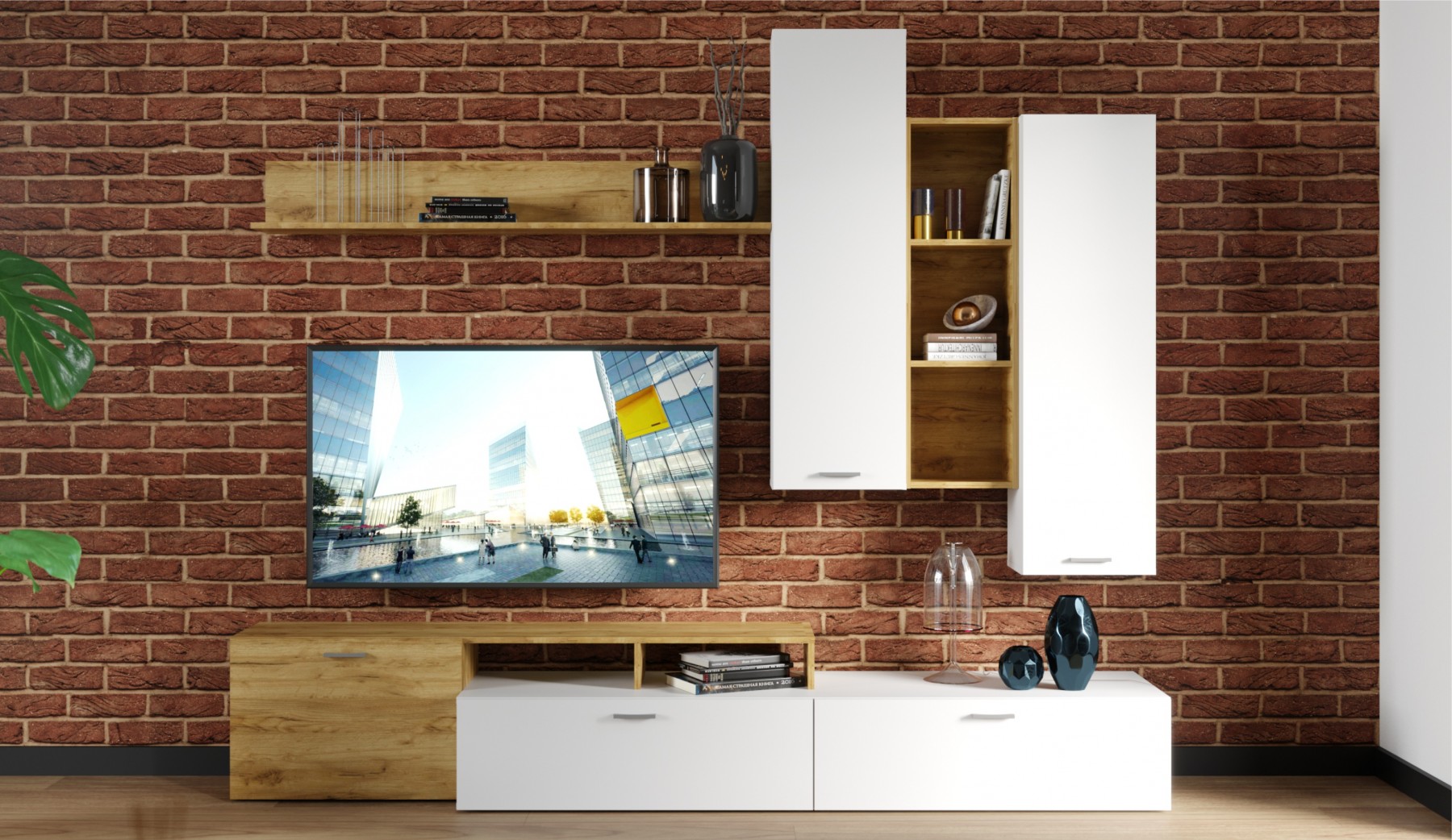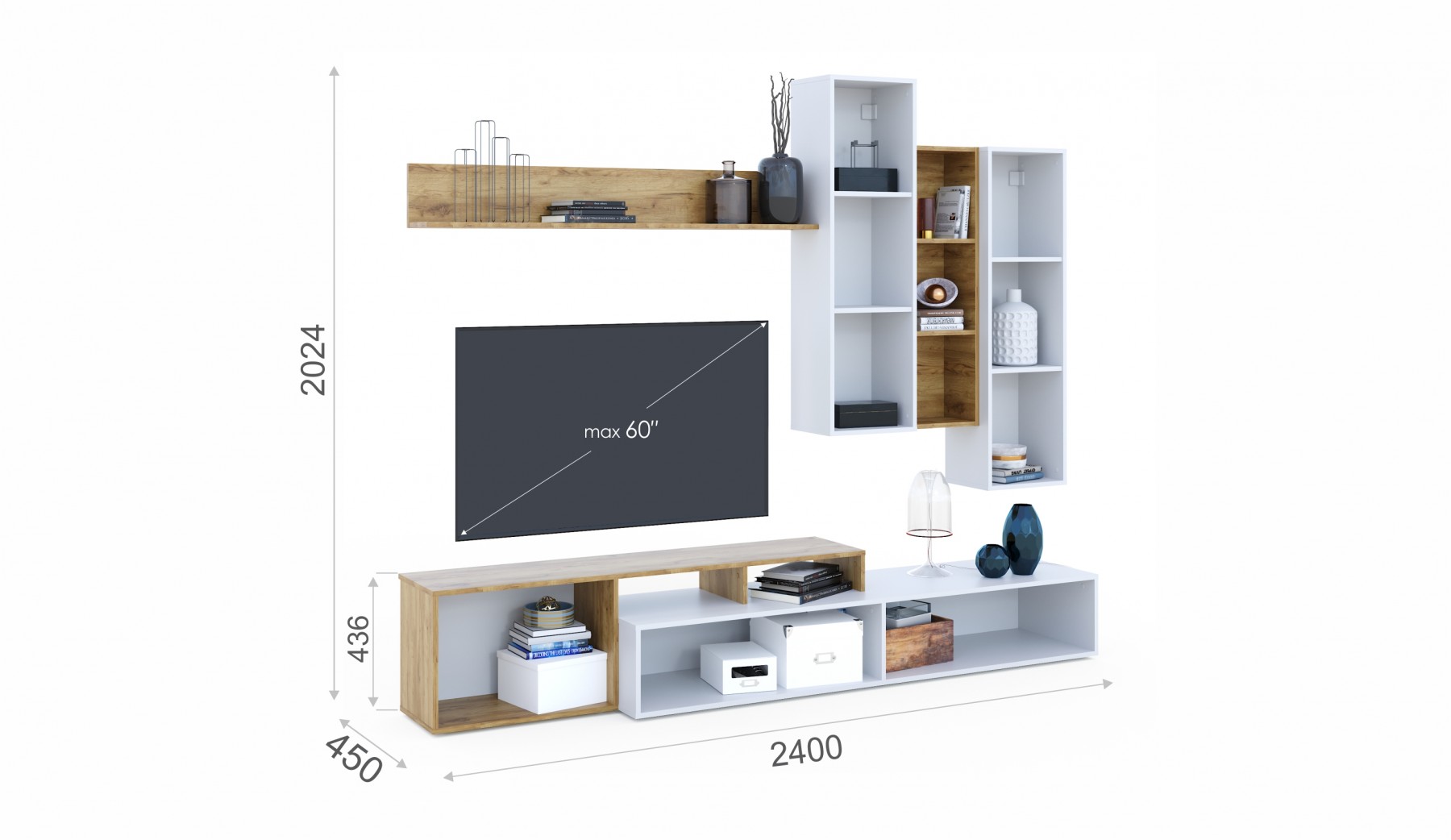 Стенка выполнена с учетом новейших дизайнерских решений - сочетание теплого оттенка дерева с четкой древесной текстурой и белого цвета, разноуровневые модули, скрытая крепежная фурнитура. Все эти элементы создают визуальную легкость и компактность стенки. Мебель легко устанавливается и регулируется по высоте. Широкая тумба для ТВ позволит разместить телевизор любой диагонали, полки послужат для размещения других медиа устройств. Стенку дополняет вместительный комод с ящиками полного выдвижения. Мебель выполнена из высококачественных экологичных материалов.