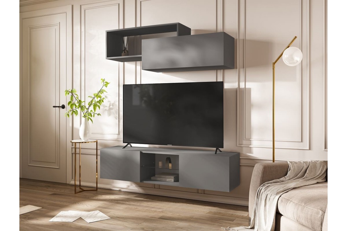 Стенка из трех модулей: TV-тумбы, навесного шкафа и книжной полки.