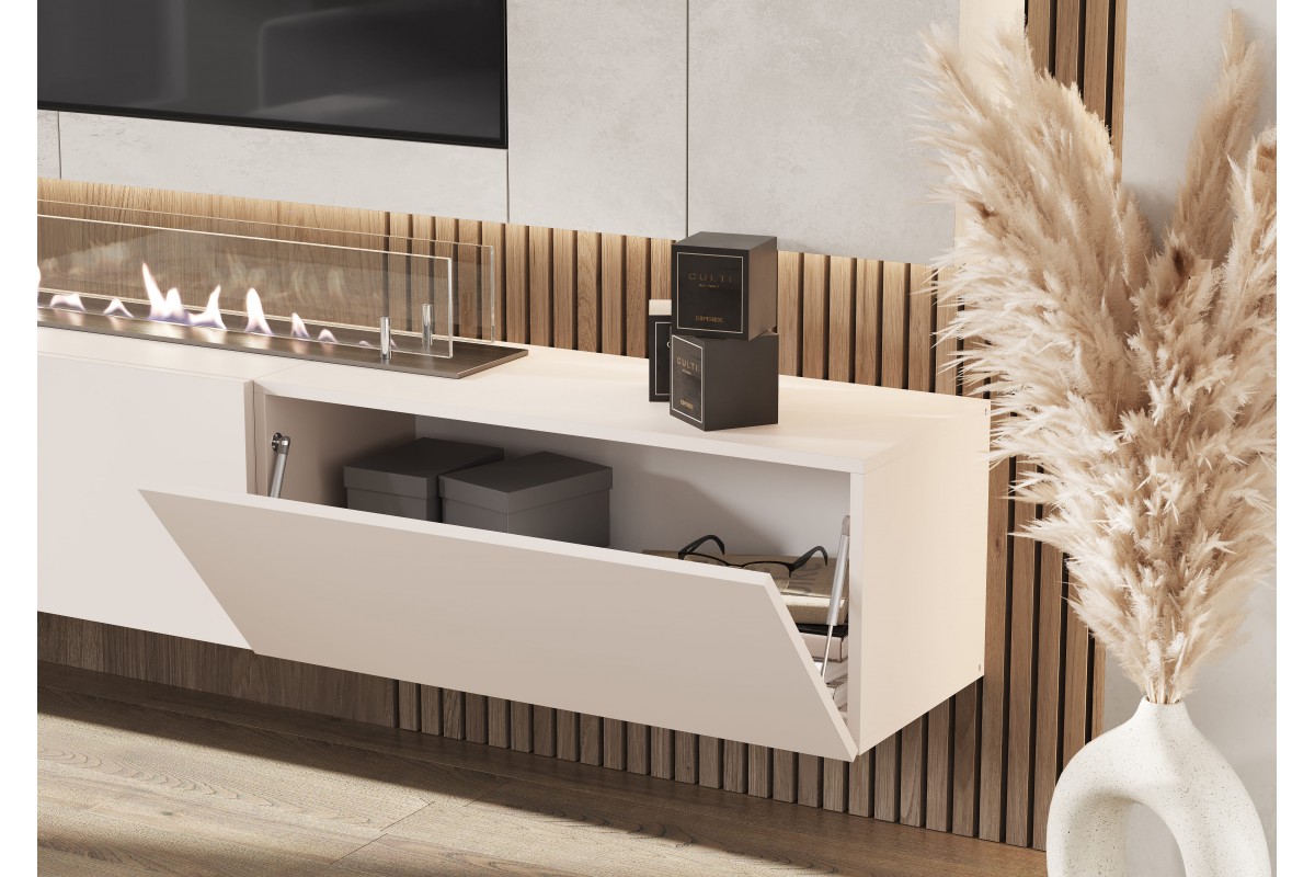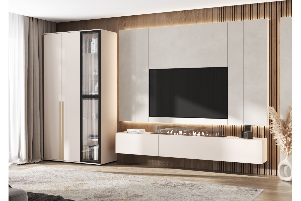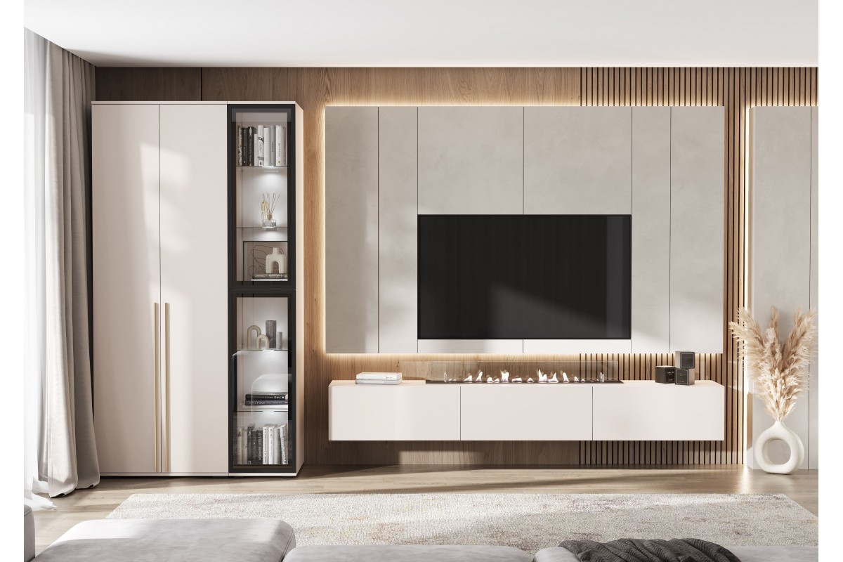 Комплект включает в себя тумбу для ТВ, тумбу с витриной, подвесной модуль и открытую полку.