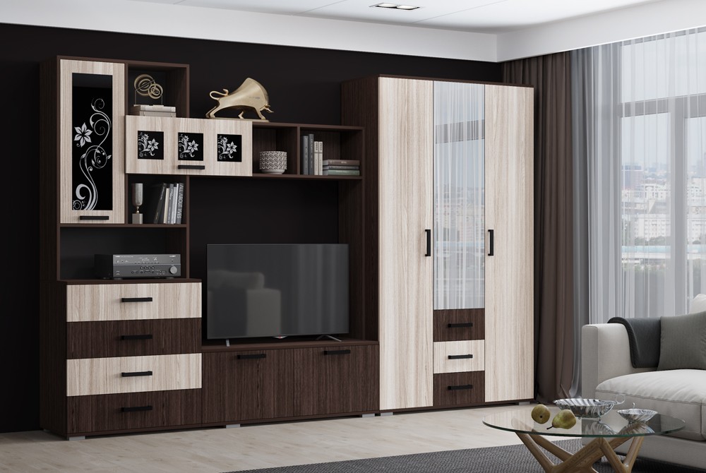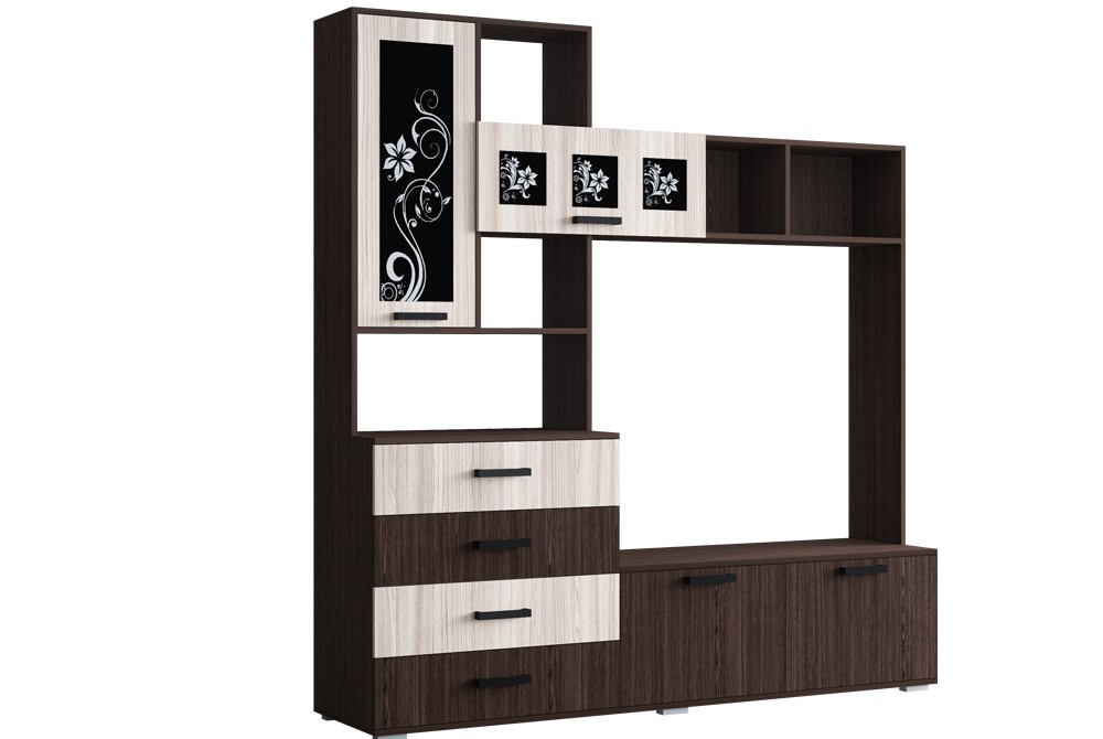 Нота 11 - многофукциональная модель, выполненая в контрастных тонах. Стенка модульная: центральная секция, шкаф №1 (2-х створчатый), шкаф №2 (3-х створчатый).