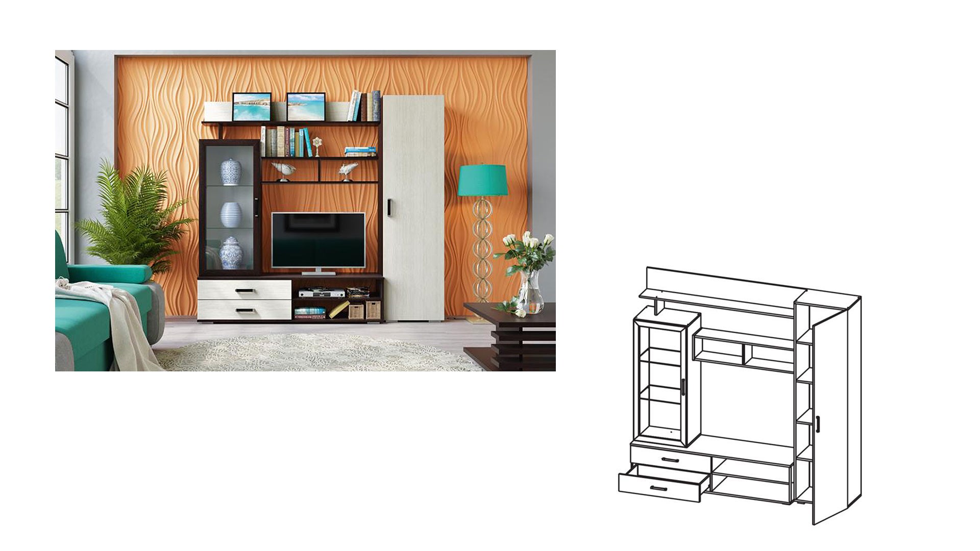 код 105004Ниша под ТВ, открытые полки, вместительный пенал, выдвижные ящики.