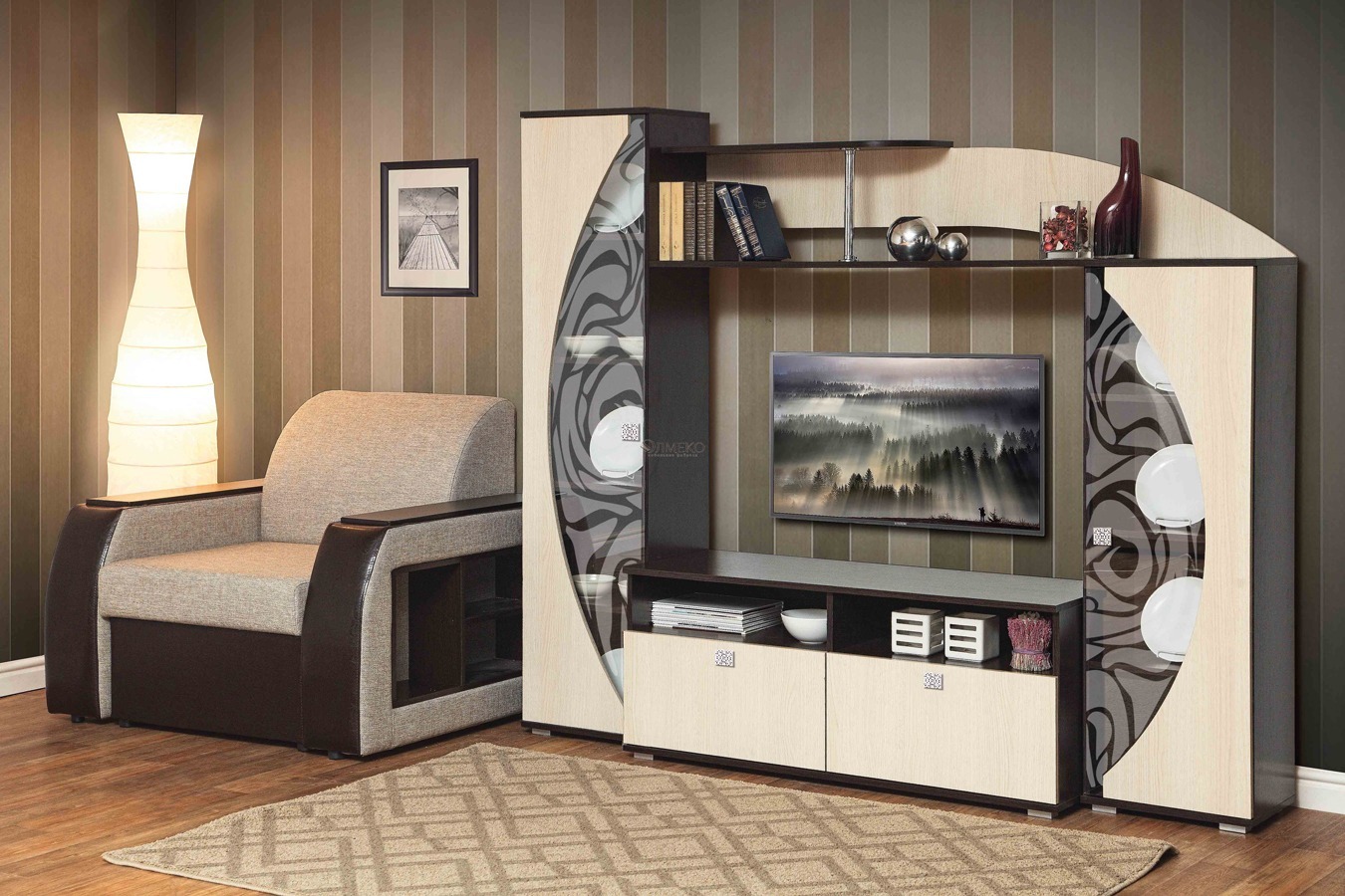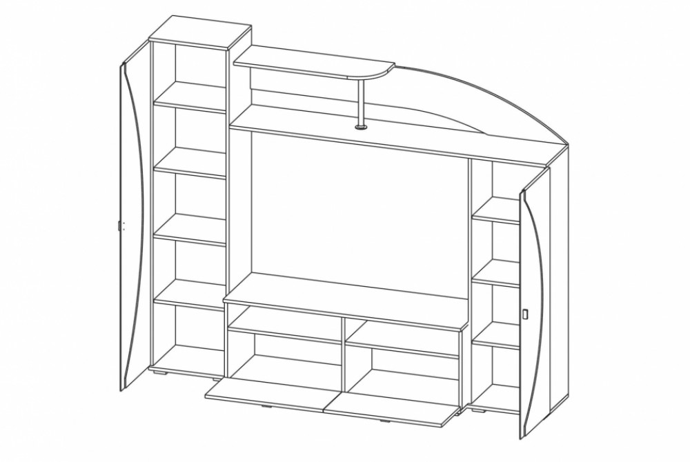 Комплектация - шкаф распашной, пенал, центральная часть с полками и ТВ нишей, зеркало.