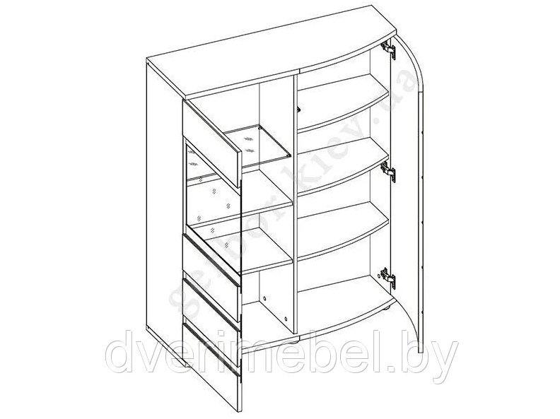 шир./выс./гл. – 100/125/36 см, левая дверь со стеклянной вставкой (внутри одна стеклянная и две деревянные полки); правая глухая дверь, согнутая по всей ширине (внутри три округлые полки).