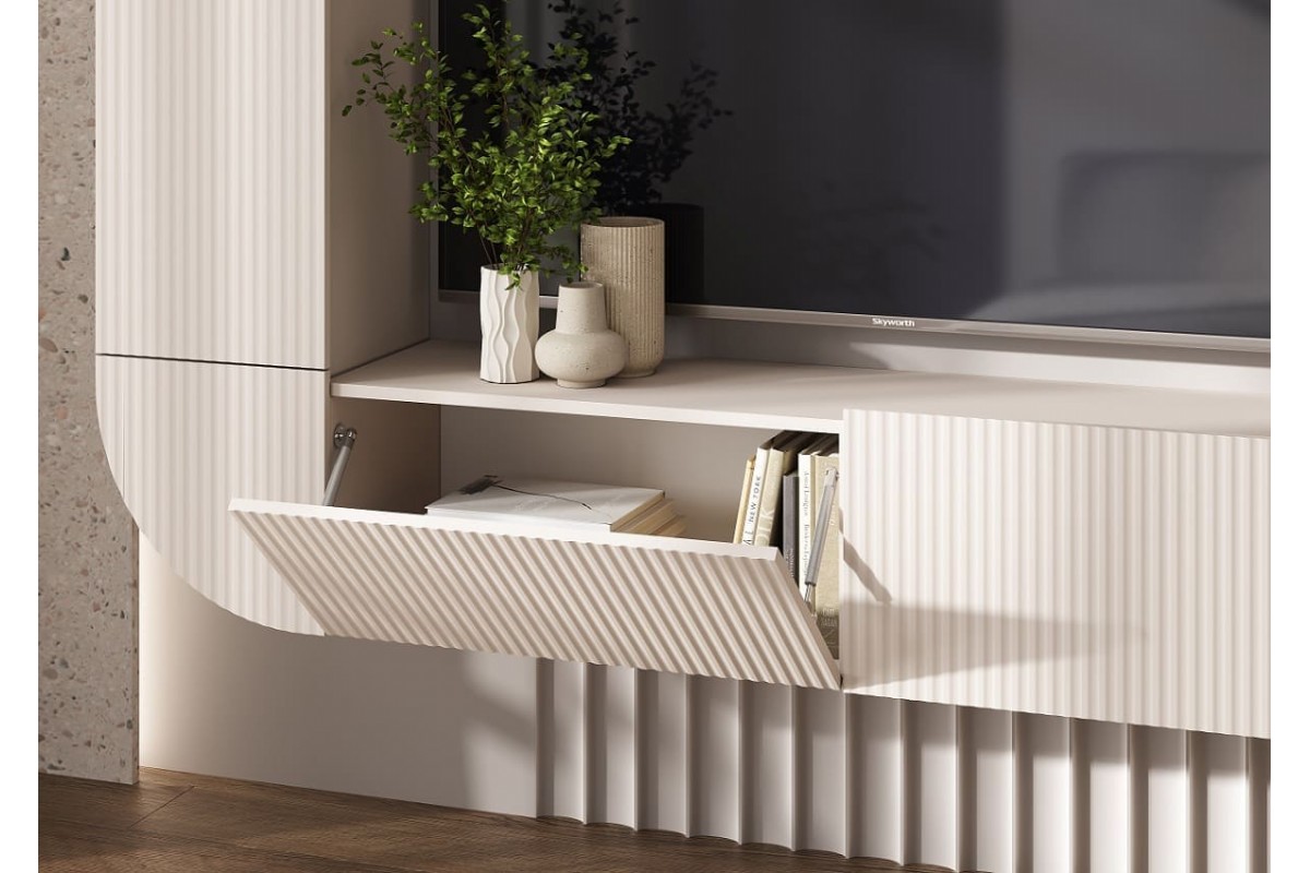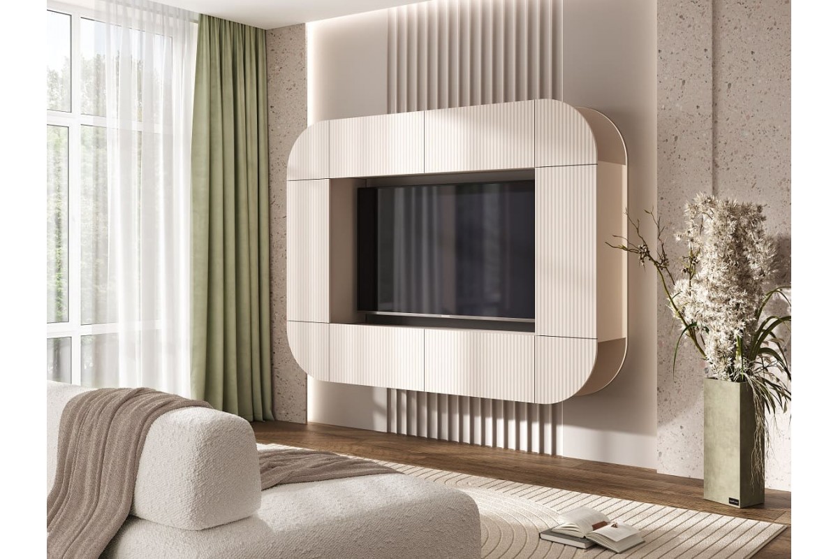 Стенка сочетает в себе компактность и функциональность. Светлый дизайн.