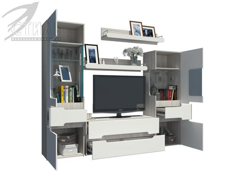Модульное исполнение представленной композиции дает возможность разместить гостиную не привязываясь к строгим габаритам комнаты, кроме того, ниша под телевизор может расширяться в зависимости от установки элементов по отношению друг к другу.