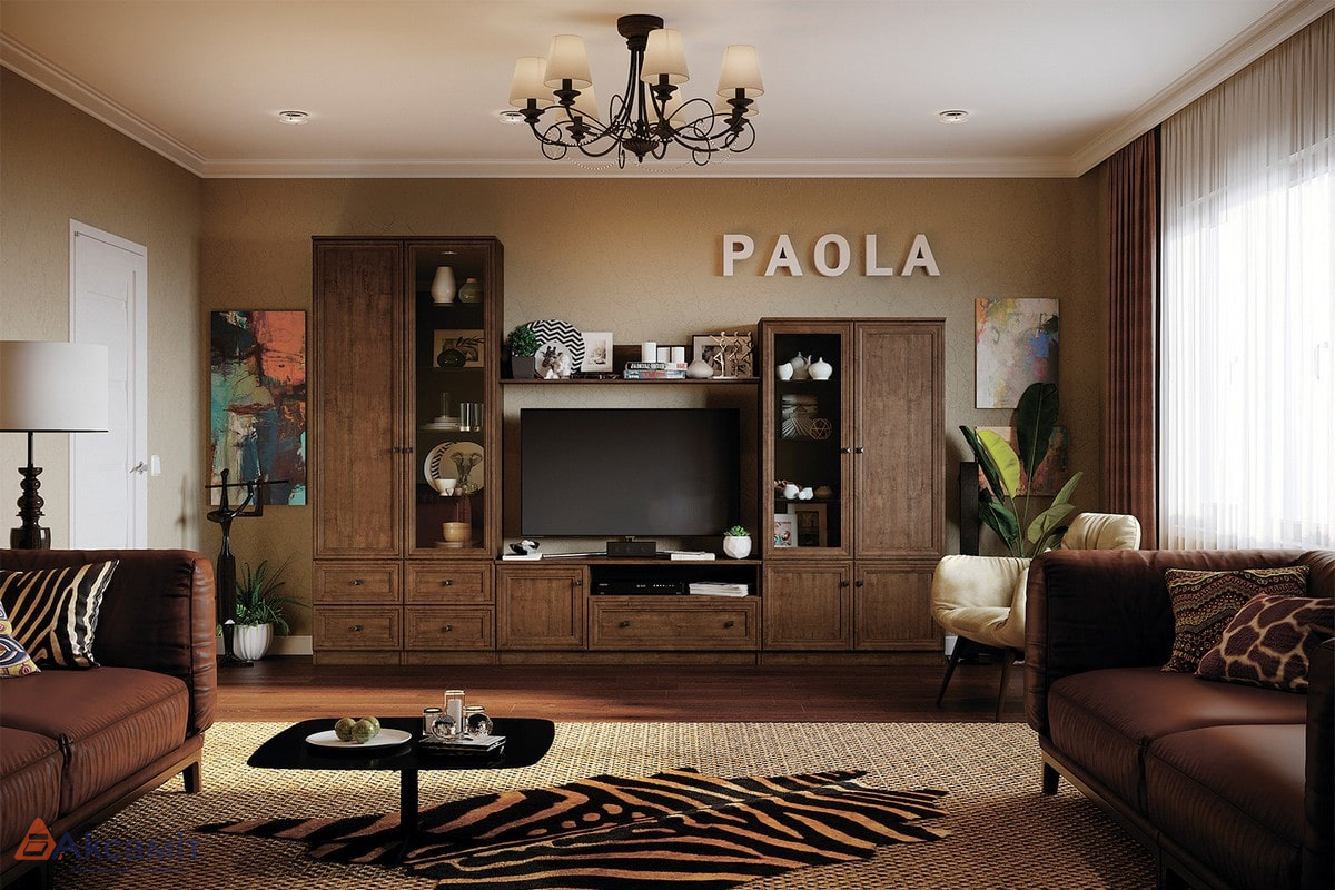армонично дополнить интерьеры разных стилевых направлений позволит многообразие модулей гостиной PAOLA. Стеклянные фасады, обрамленные сложным профилем МДФ, и тёмная цветовая гамма хорошо сочетается с любой современной мебелью и легко впишется в обстановку. Оптимальные габариты модулей коллекции позволят сохранить свободное пространство без ущерба функциональности.