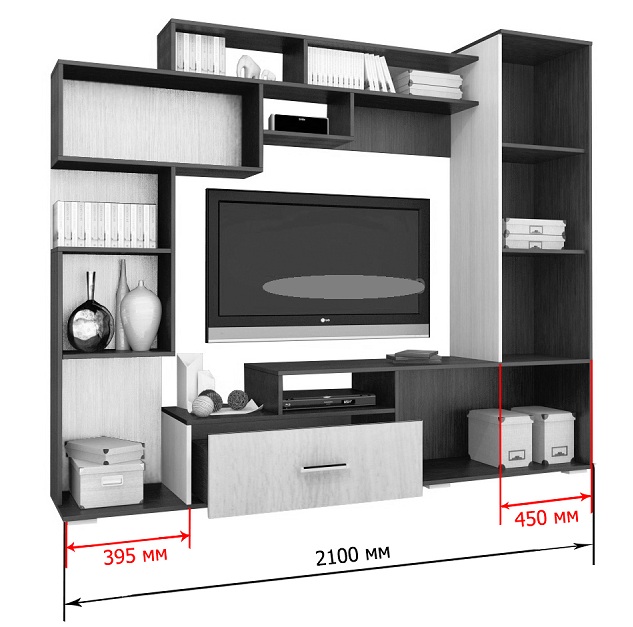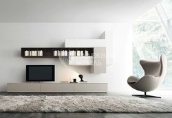 Скандинавская стенка в гостиную. Множество ниш для хранения.