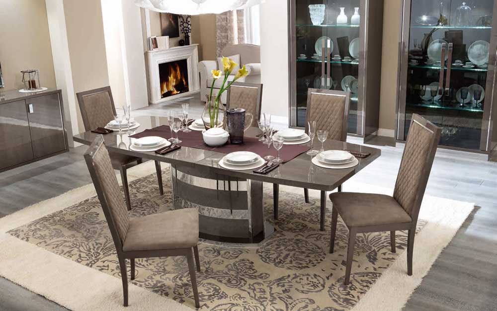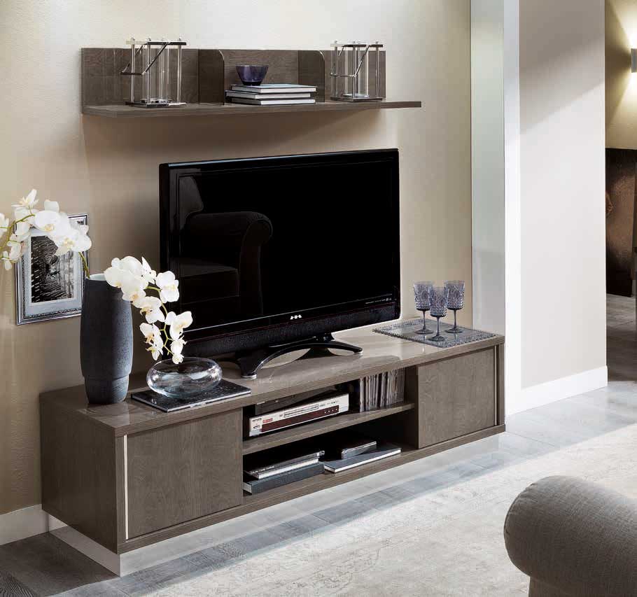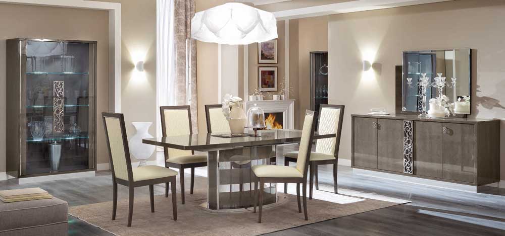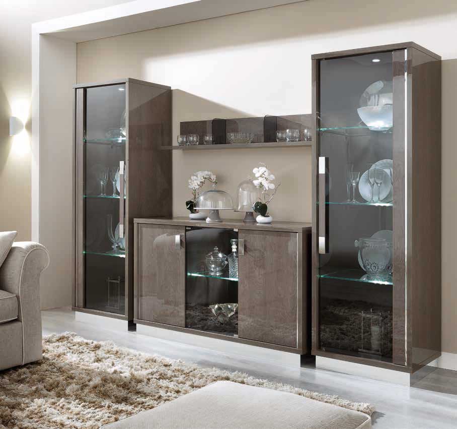 Витрины и тумба ТВ Platinum, кофейный столик и угловой столик сочетаются с диваном Dama. Новая элегантная и функциональная навесная полка. Деталь механизма push-pull на двери с серо-дымчатыми стеклaми выдвигает на первый план металлическую пластину с покрытием от антиотпечатков пальцев. Вставка раздвижного стола складывается книгой и превосходно скрывается в основании стола. Стеклянным дверям придана волнообразная форма, поэтому они прекрасно гармонируют с узорными ручками, являющимся визитной карточкой этой коллекции. Стекла серо-дымчатого цвета и стулья из мягкой стеганой экокожи Nabuk.