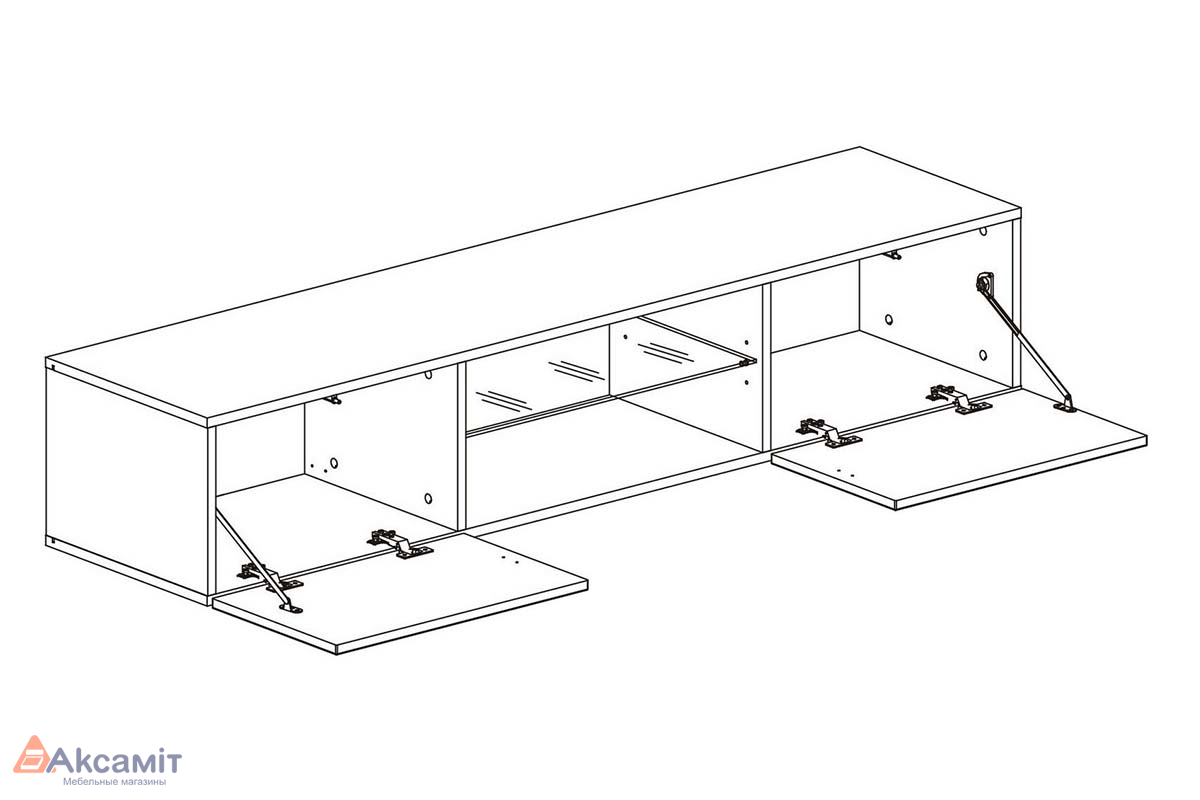 Двухуровневая тумба с прямоугольной крышкой для гостиной с подвесными модулями. Распашные ящики без ручек.