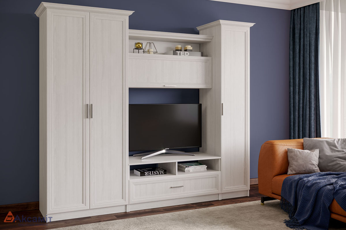 Современная стенка со светлыми фасадами. Стильный дизайн.