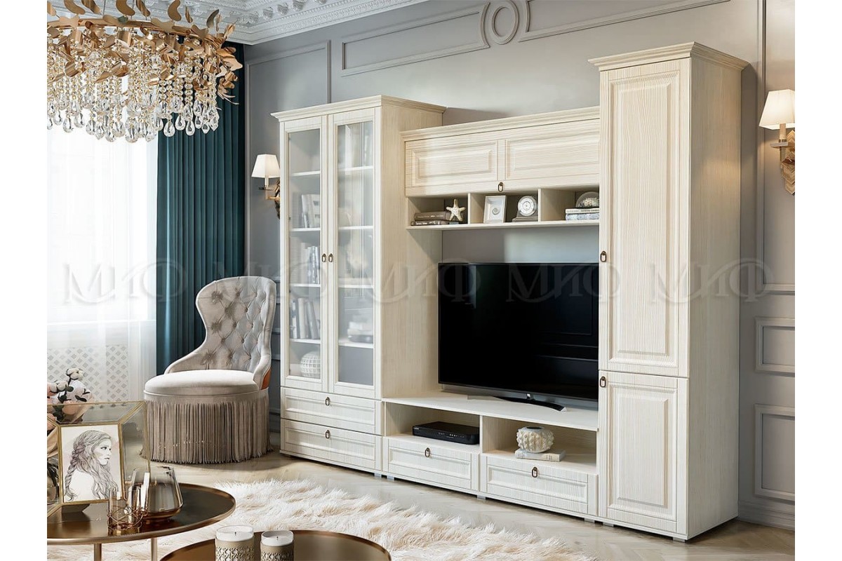 Комплект состоящий из центральной секции, пенала и шкафа. Наличие книжных полок, ниши для ТВ, ящиков и шкафчиков.