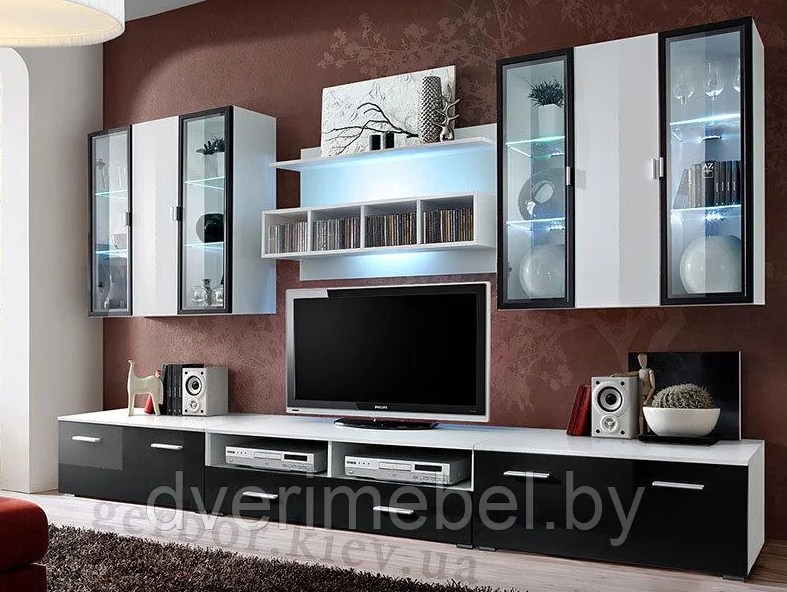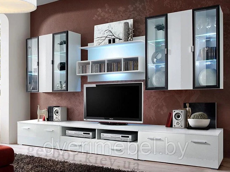 Вместительная система хранения, наличие тумбы для ТВ, открытых полок и шкафчиков.