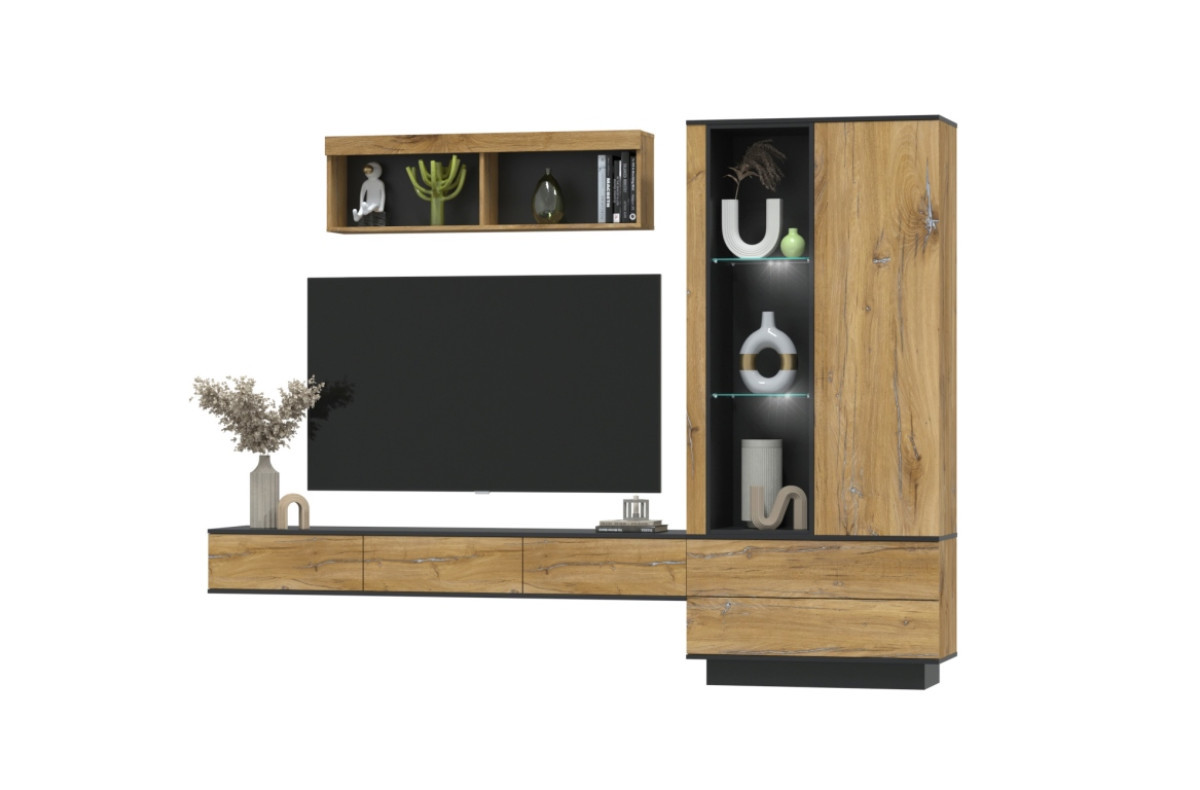 - Цвет корпуса: Дуб нокс/чёрный. Изысканное сочетание тёплых оттенков дуба и элегантного чёрного цвета придает гостиной особый шарм.
