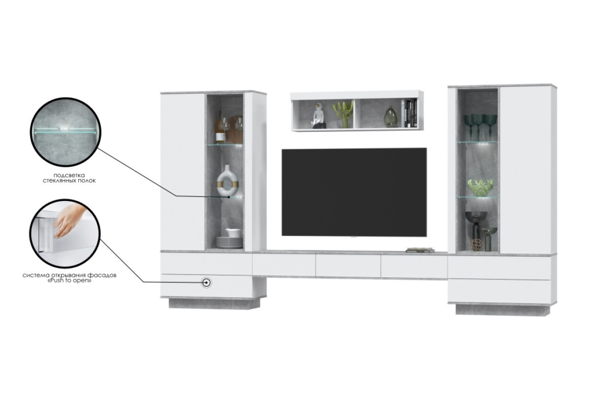 Стенка белая без ручек. Широкая ниша для ТВ. Крепление к стене.