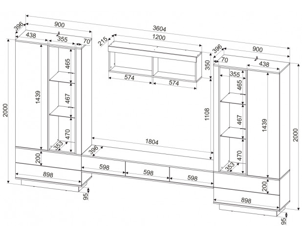 Два остекленных стеллажа, ТВ-тумба, комод, журнальный стол, подвесные полки.