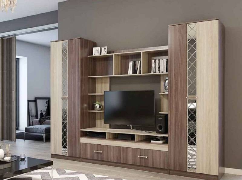 Модульная гостиная состоит из тумбы под телевизор, шкафа, стеллажа и двух навесных полок