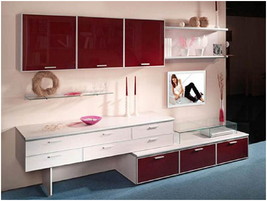 Бордово-молочная стенка своими насыщенными цветами сразу создаст настроение в интерьере. Навесные шкафчики с белой окантовкой соседствуют со светлыми открытыми полками. Внизу располагаются закрытые полки и тумбы, весьма вместительные и яркие. Глянцевые поверхности предметов мебели добавляют гарнитуру сочности, делают цвет более живым. Дополнительно включены легкие прозрачные полки.