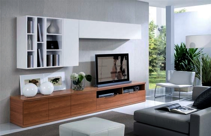 Белые фасады гостиной визуально сделают комнату светлее, отражая свет от своей поверхности. Несколько отрытых полок и закрытых шкафчиков разного размера, придутся как нельзя кстати, при размещении любимых книг и декоративных вещей.