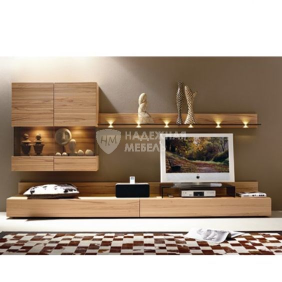 Модель состоит из двух витрин, тумбы под ТВ и подвесной полки.