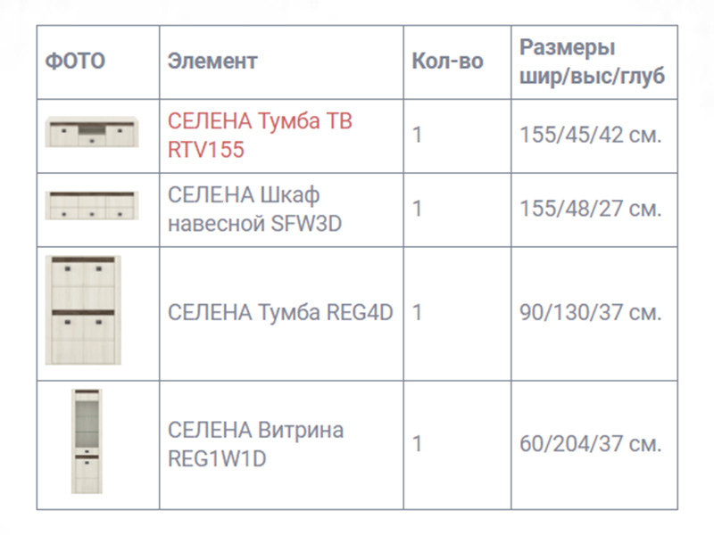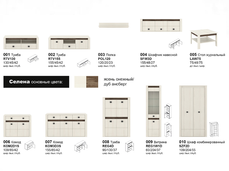 Модульная система предназначена для обустройства гостиных и жилых комнат. Современный дизайн подчеркнут прямыми линиями, комбинацией контрастных тонов в декоре и оригинальными ручками. Мебель оснащается качественной фурнитурой, витрины дополнены подсветкой. Предложенный вариант компоновки состоит из четырех модулей, однако вы можете доукомплектовать его другими предметами из коллекции «Селена».