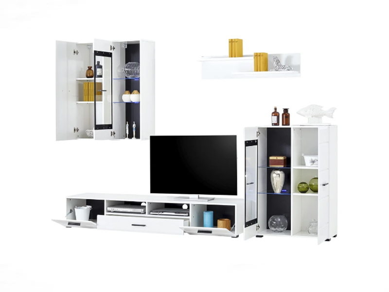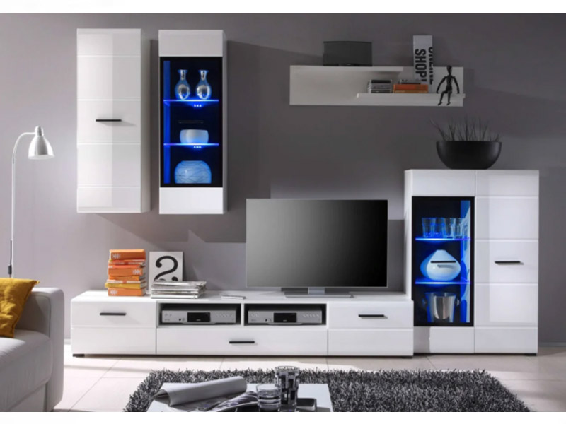 Минималистичный набор мебели с LED-подсветкой витрин гармонично дополнит современную гостиную. Белый цвет, остекленные шкафы и глянцевые фасады – детали, которые помогают визуально расширить пространство.