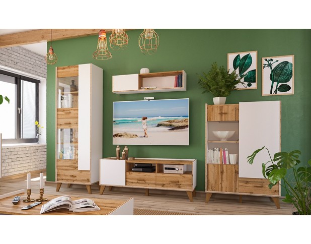 Калипсо — коллекция для гостиной, в которой выразительность сочетается с утонченностью благодаря теплой текстуре дерева и глубоким зеленым акцентам.