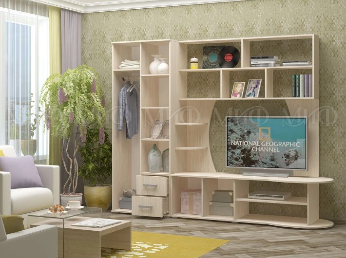 Модульная коллекция мебели для обустройства гостиной. Материал: ЛДСП, МДФ покрытый плёнкой.