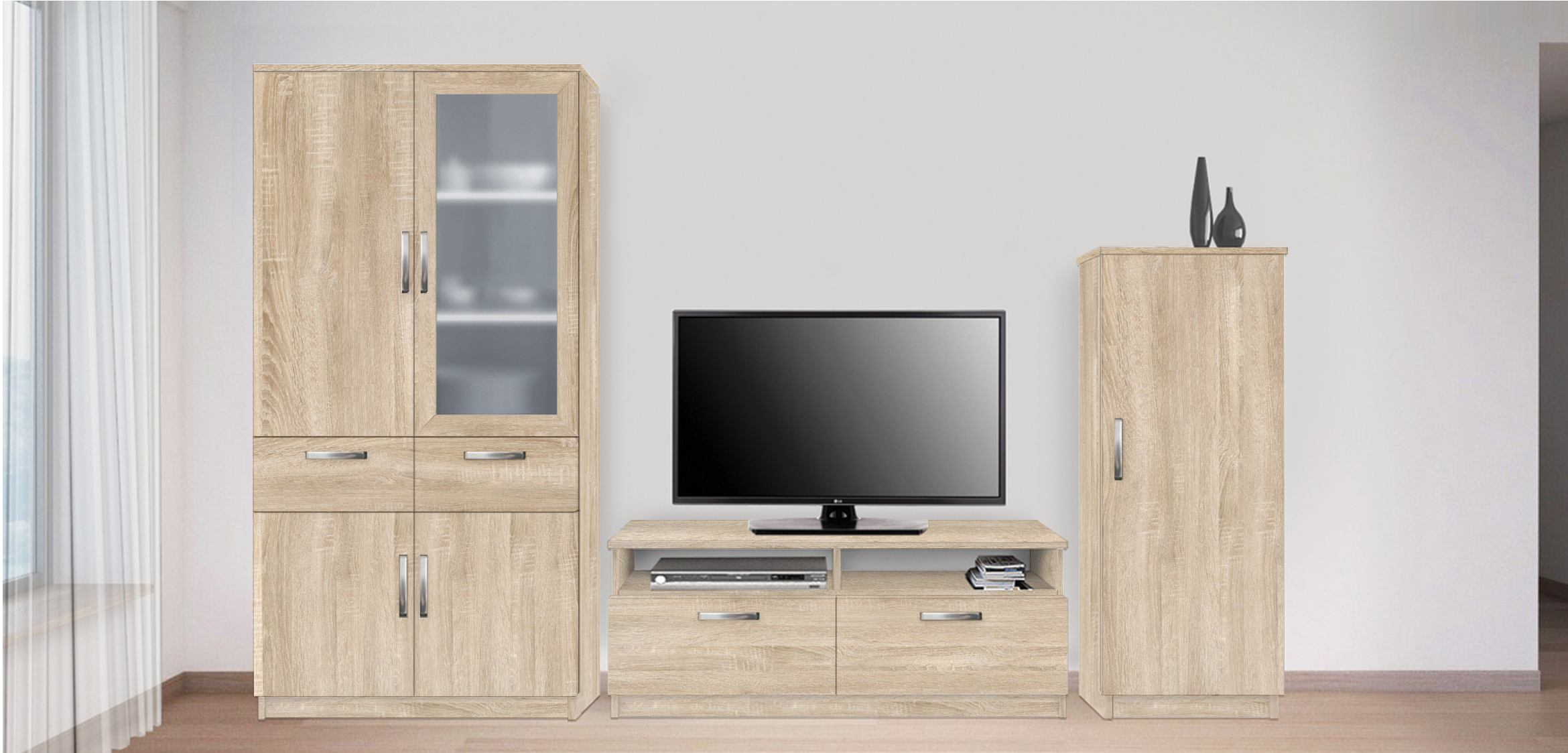 В состав комплекта входит: комод, тумба, шкаф, полка навесная.
