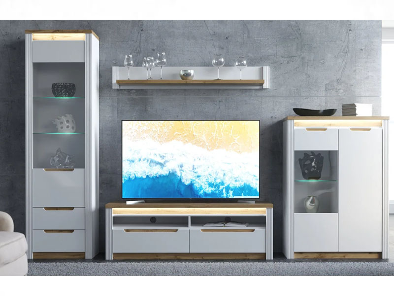 Готовая гостиная (продается только набором) состоит из четырех предметов – двух витрин с подсветкой, тумбы под телевизор и книжной полки. Эффектное сочетание белого глянца и древесного тона придает мебели современный вид. Ручки представлены вырезами на фасадах с контрастными вставками.