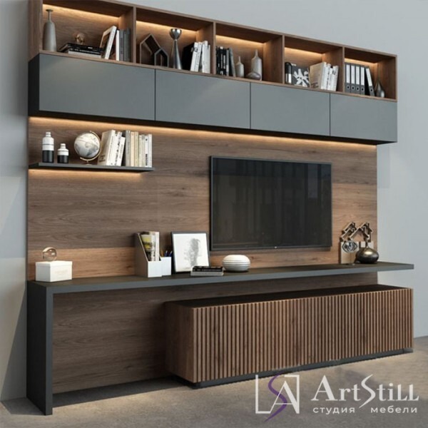 Мебель в гостиную под заказ выполнена в современном стиле. Выбор мебели на заказ позволяет подобрать материал нужного цвета и качества. А так же укомплектовать фурнитурой наиболее подходящей по качеству и цене. Фрезерованный фасад из массива стал акцентом тумбы. Свет подчеркнул длинные полки, а так же сделал навесные ящики легче.
