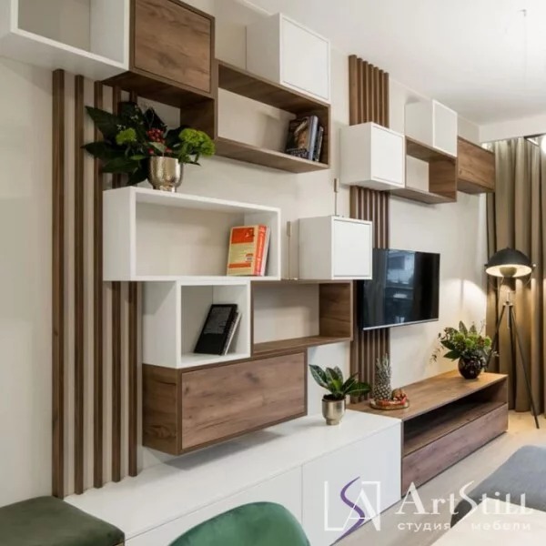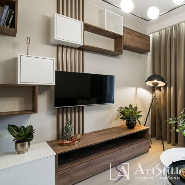 Модульная гостиная состоит из тумбы под телевизор, шкафа, стеллажа и двух навесных полок