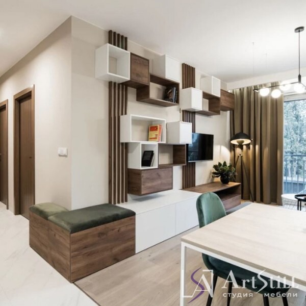 Мебель в гостиную под заказ выполнена в современном стиле. Выбор мебели на заказ позволяет подобрать материал нужного цвета и качества. А так же укомплектовать фурнитурой наиболее подходящей по качеству и цене. Стена не смотрится перегруженной.