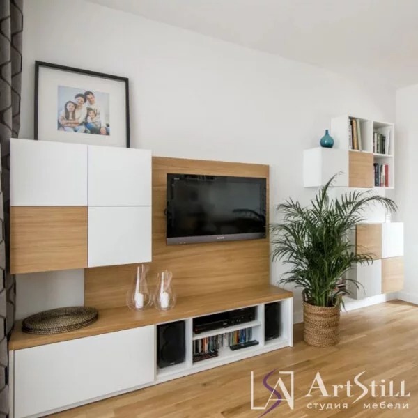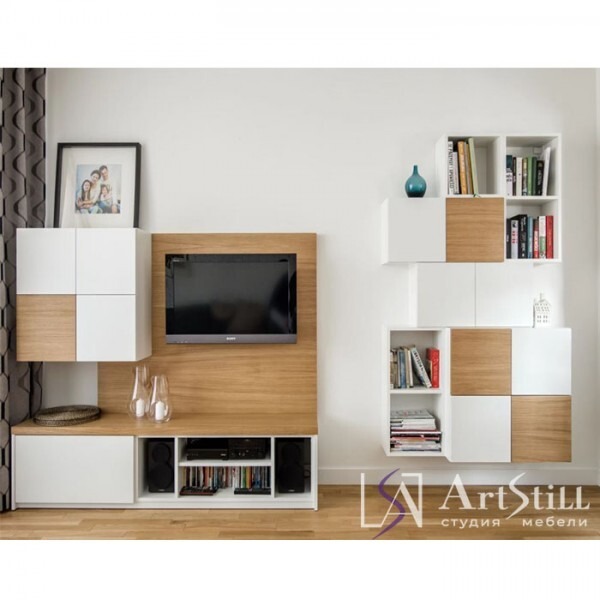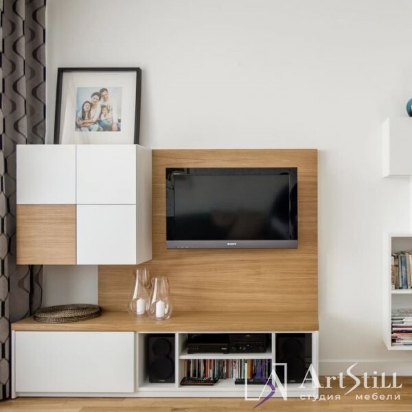 Мебель в гостиную под заказ выполнена в современном стиле. Выбор мебели на заказ позволяет подобрать материал нужного цвета и качества. А так же укомплектовать фурнитурой наиболее подходящей по качеству и цене. Разные по размерам ящики скомпонованы в единый ансамбль. Стена не смотрится перегруженной.