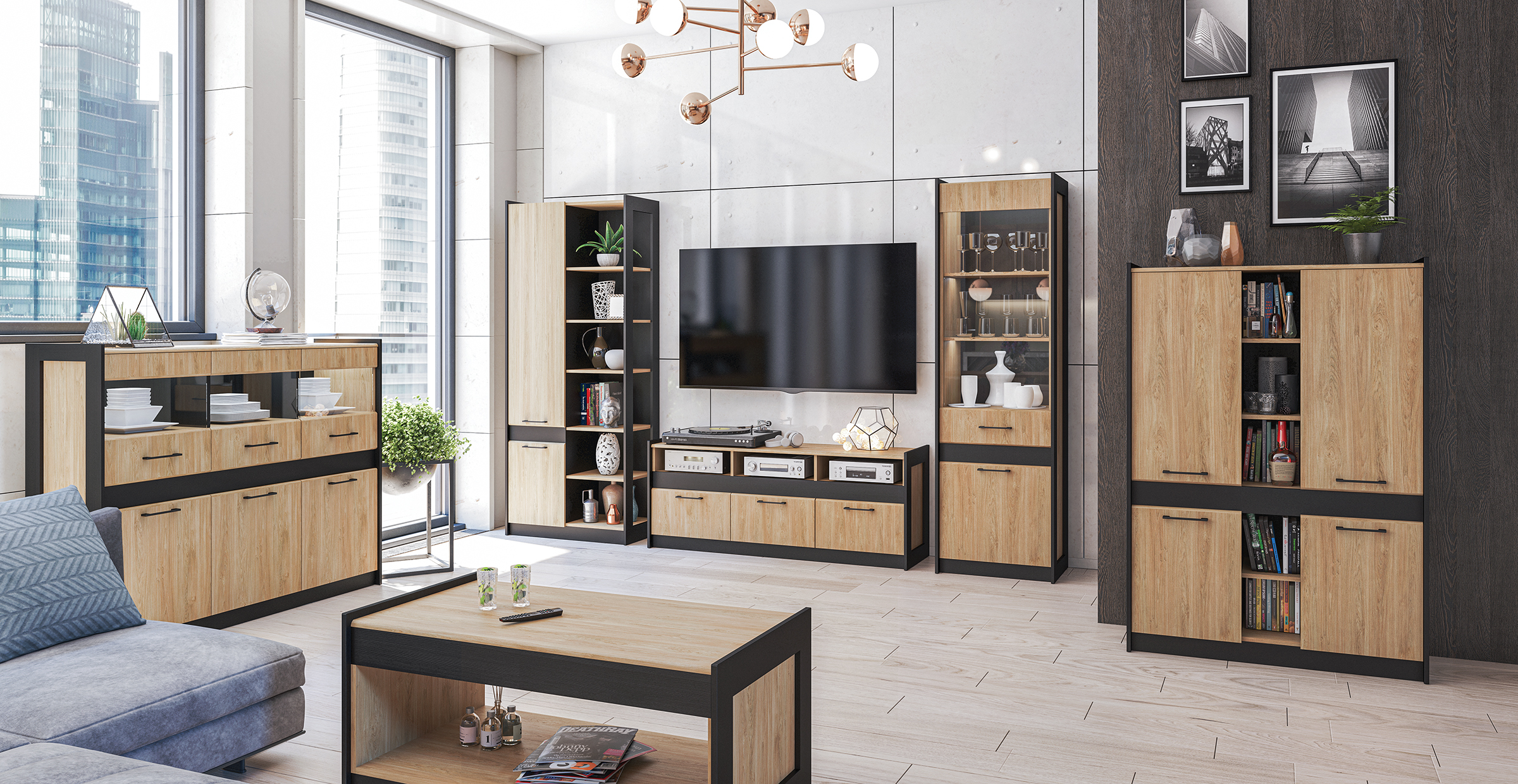 код 151763Модульная коллекция мебели в цвете дуба с черным обрамлением. Материал: ЛДСП.