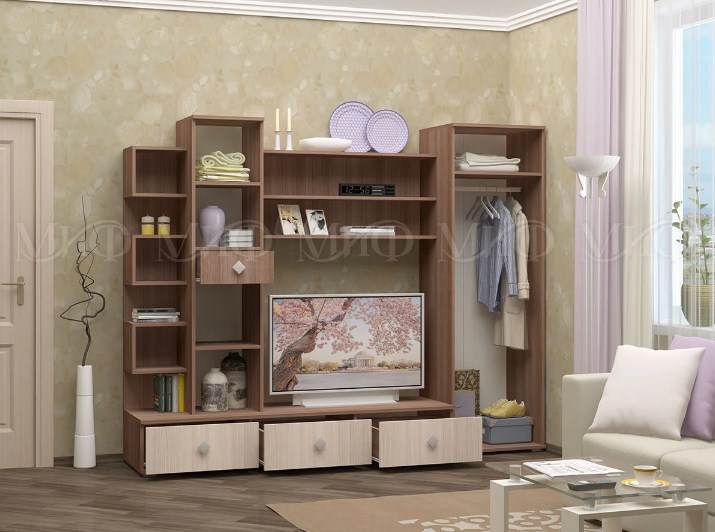 Функциональность стенки представлена наличием множества открытых и закрытых полок.
