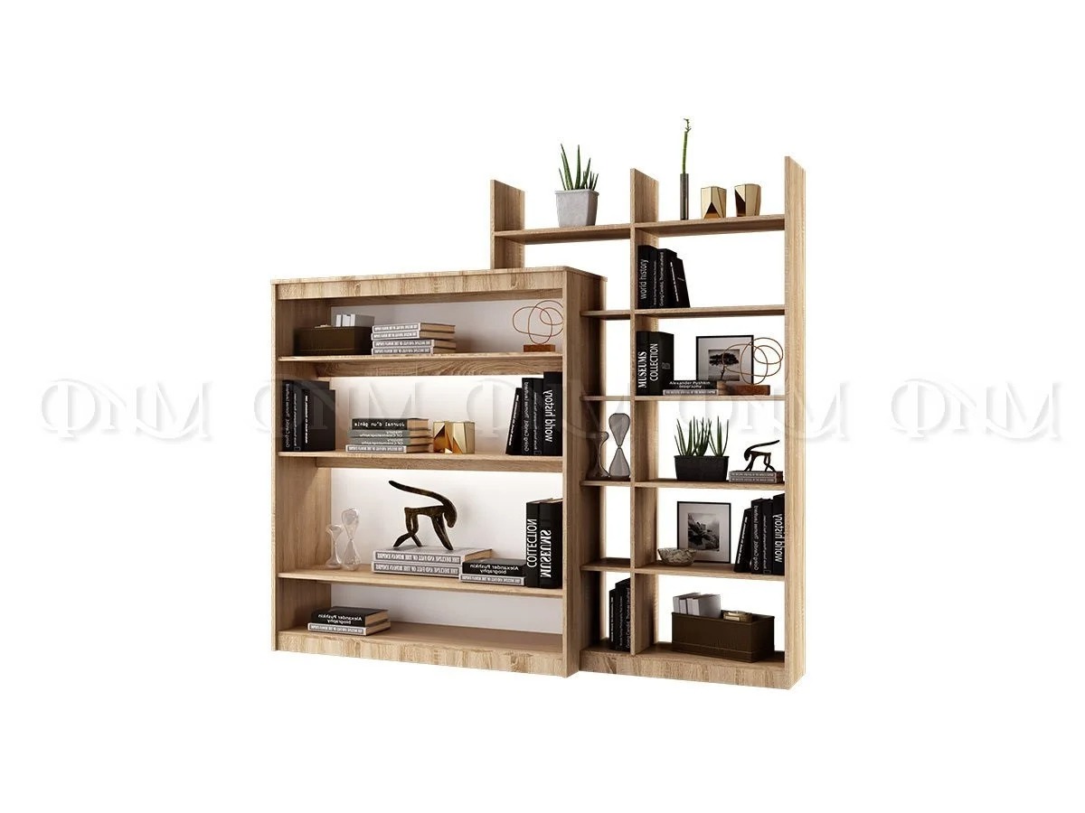 В комплект входит два вместительных шкафа, тумба ТВ, витрины и полки.