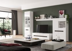 Стильная гостиная с витринами, пеналами, ящиками и местом для ТВ.