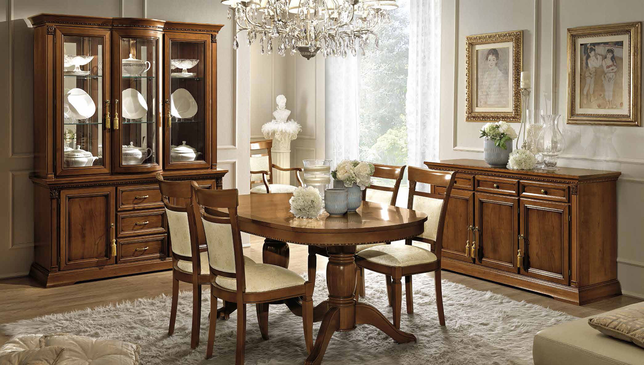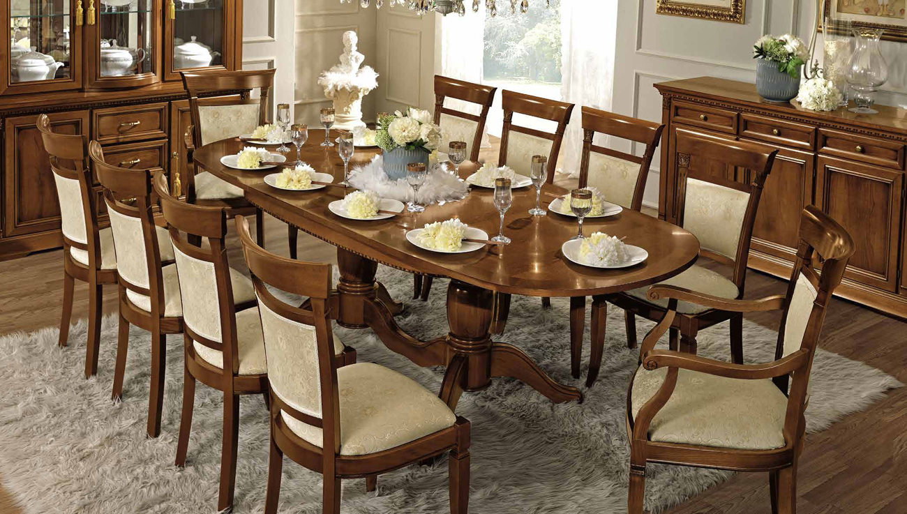 Овальный обеденный стол в разложенном виде имеет размеры 2,40 метра и прекрасно подойдёт для комфортного обеда на 10 персон. Использование направляющих hi-tech обеспечивает надёжную работу механизма и исключает прогибы по краям. Основание под столешницей украшено характерным карнизом Treviso имеющим дугообразную гравировку.